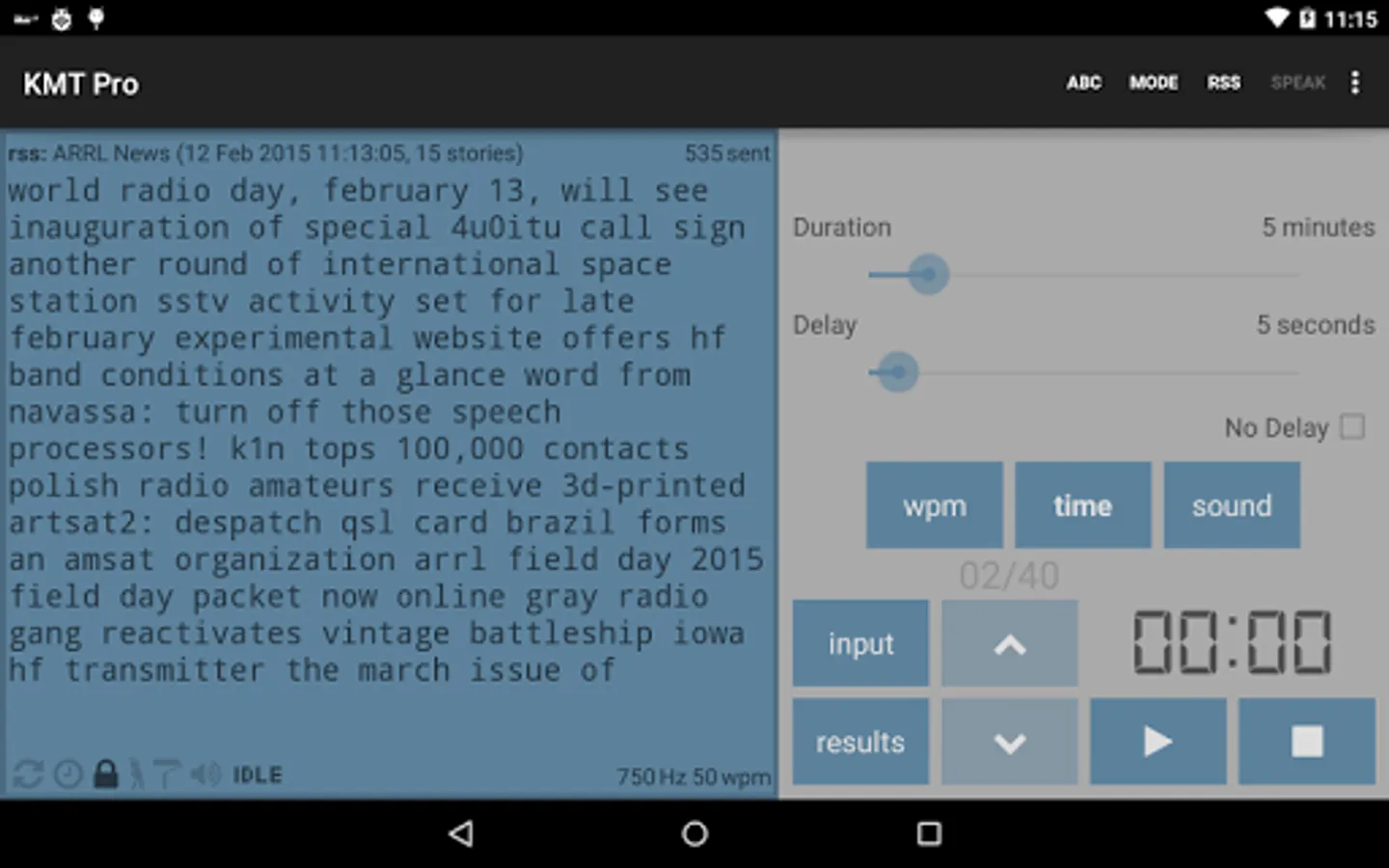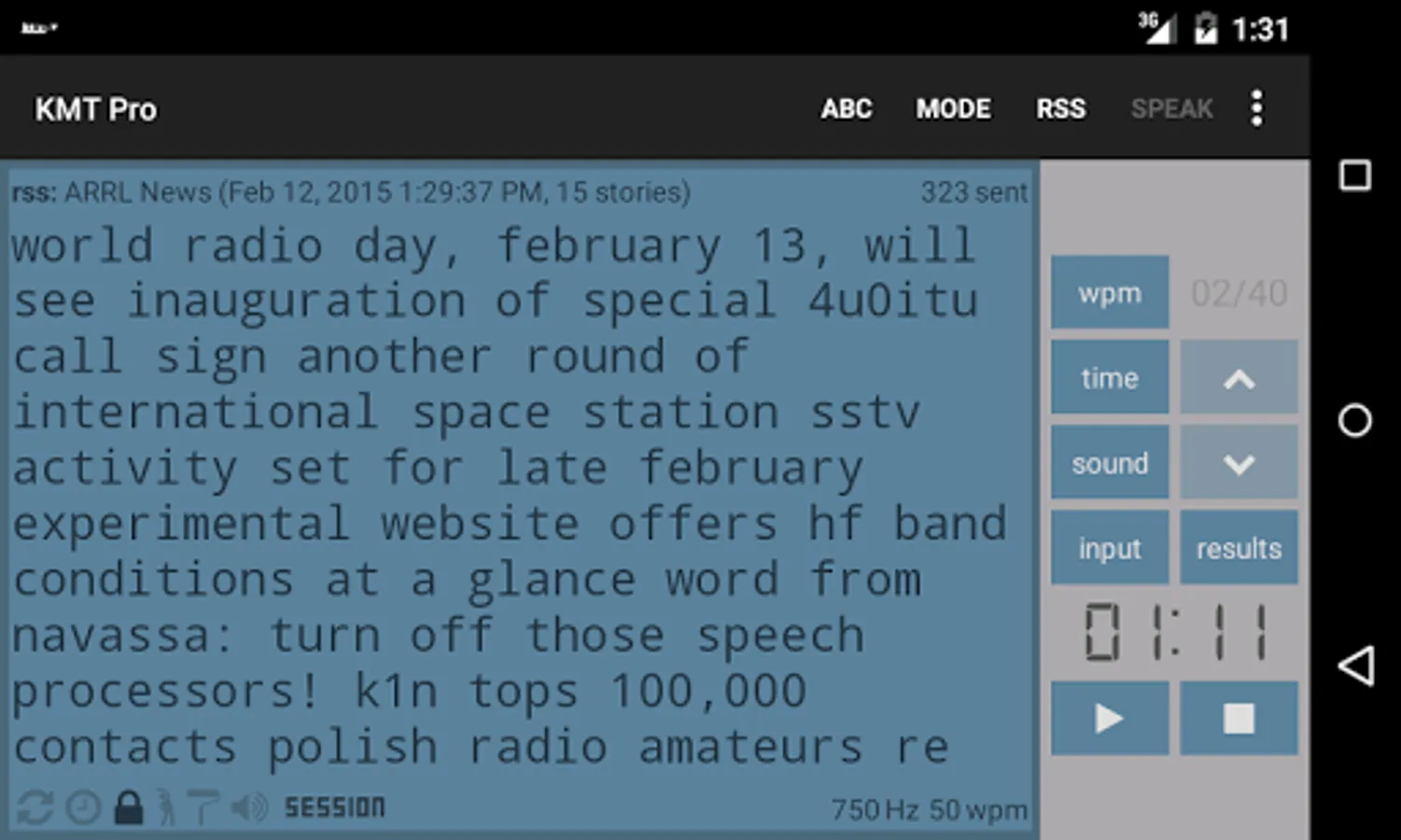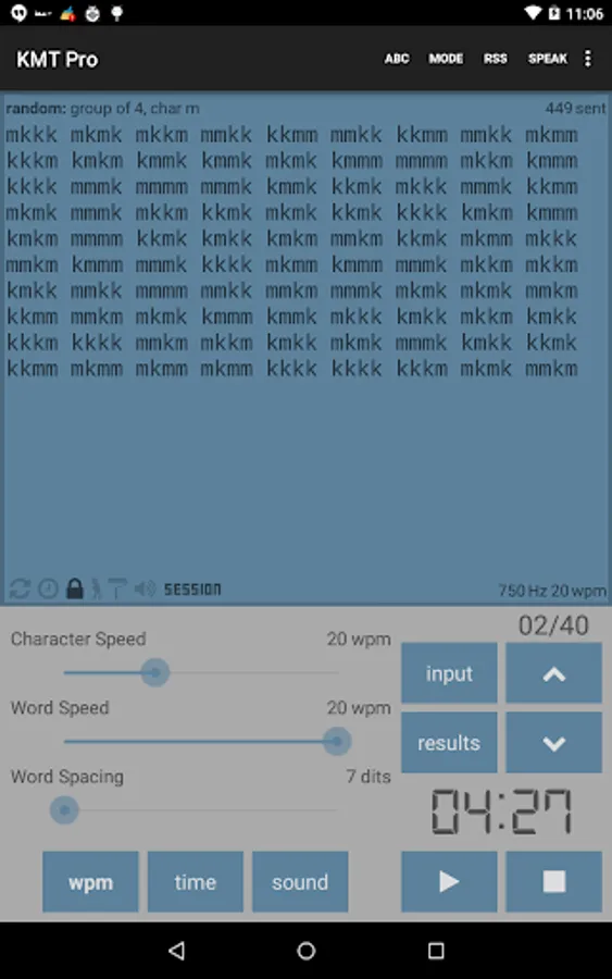 ✓ Eight modes: random, 100 common words, 1000 common words, (German users can also select 100 and 1000 common German words), QSO (includes prosigns), callsign, morse abbreviations, custom text (which also allows you to input & practice prosigns also), and RSS Feeds