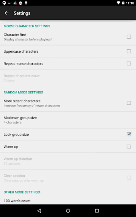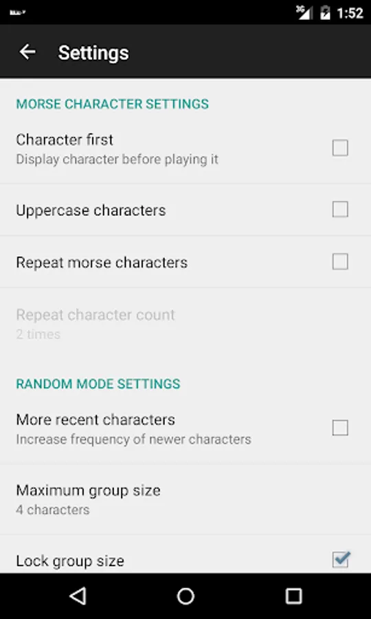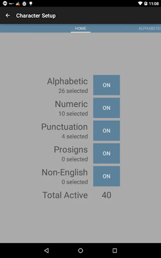 ✓ Character setup option screen to include/exclude characters, such as punctuation, prosigns and non-english characters - this also allows you to learn additional characters