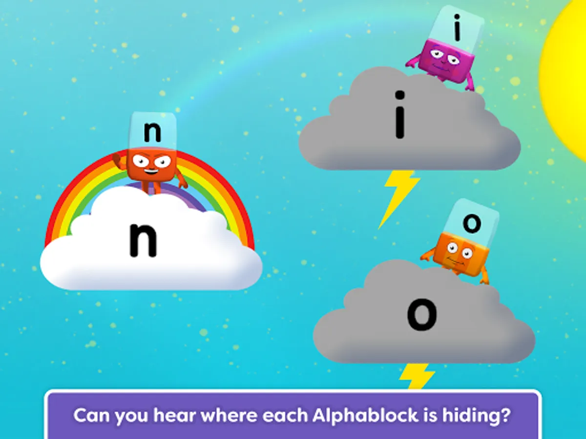 ◆ Hide and seek — listen carefully to tell letter sounds apart, and see if you can spot where the Alphablock is hiding.