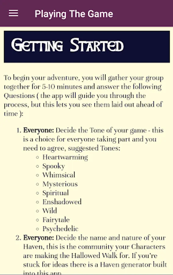 This is not a mobile game in the conventional sense of a game you play on your device, instead it is a mobile implementation of the Hallowed Walk game cards and rulebook, so that instead of having to print out and carry cards with you, you can carry a mobile phone and use that to guide you through play.