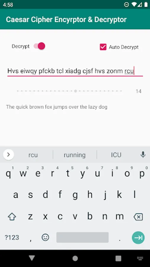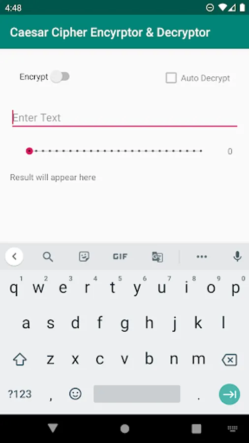 This program allows you to quickly Encrypt and Decrypt Caesar Ciphers, on your phone, it also features an automatic decryption algorithm which tries all 26 combinations at once before returning the most likely result.