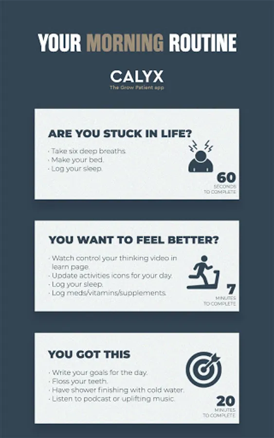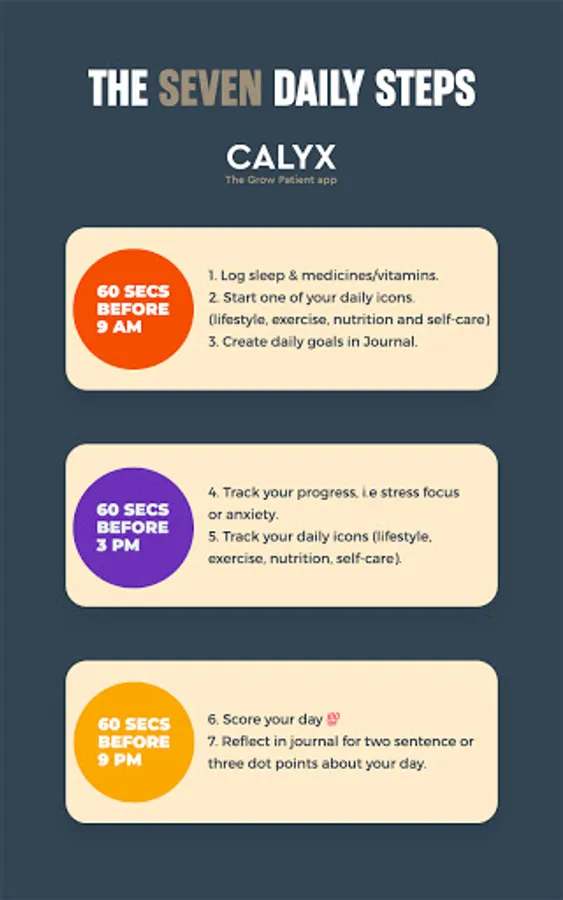 Think of your Calyx App like an old fashioned diary or planner that walked into the future. Connection to your doctor like never before, secure personal data, connectivity with Apple or Google health apps, journalling, daily tasks, tracking, and mental health counselling is all FREE.