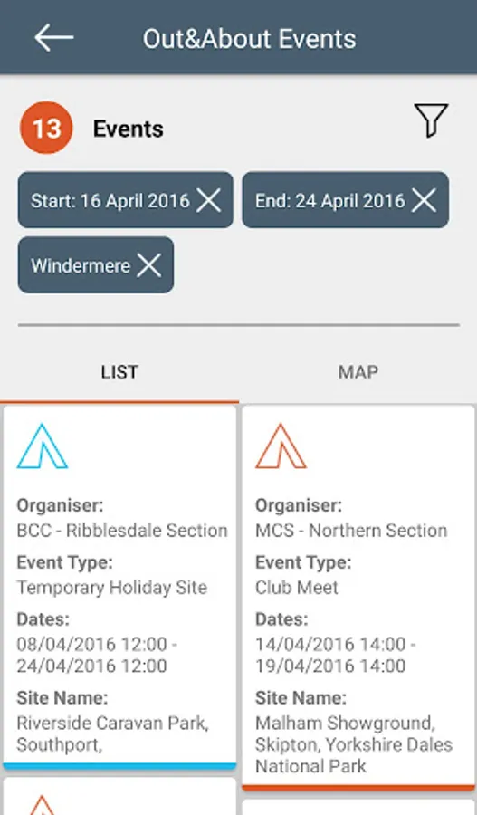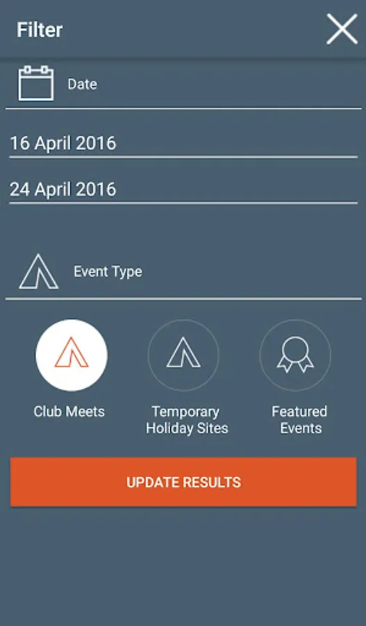 Filter your results by date and by event type (Club Meets, Temporary Holiday Sites and Featured Events)