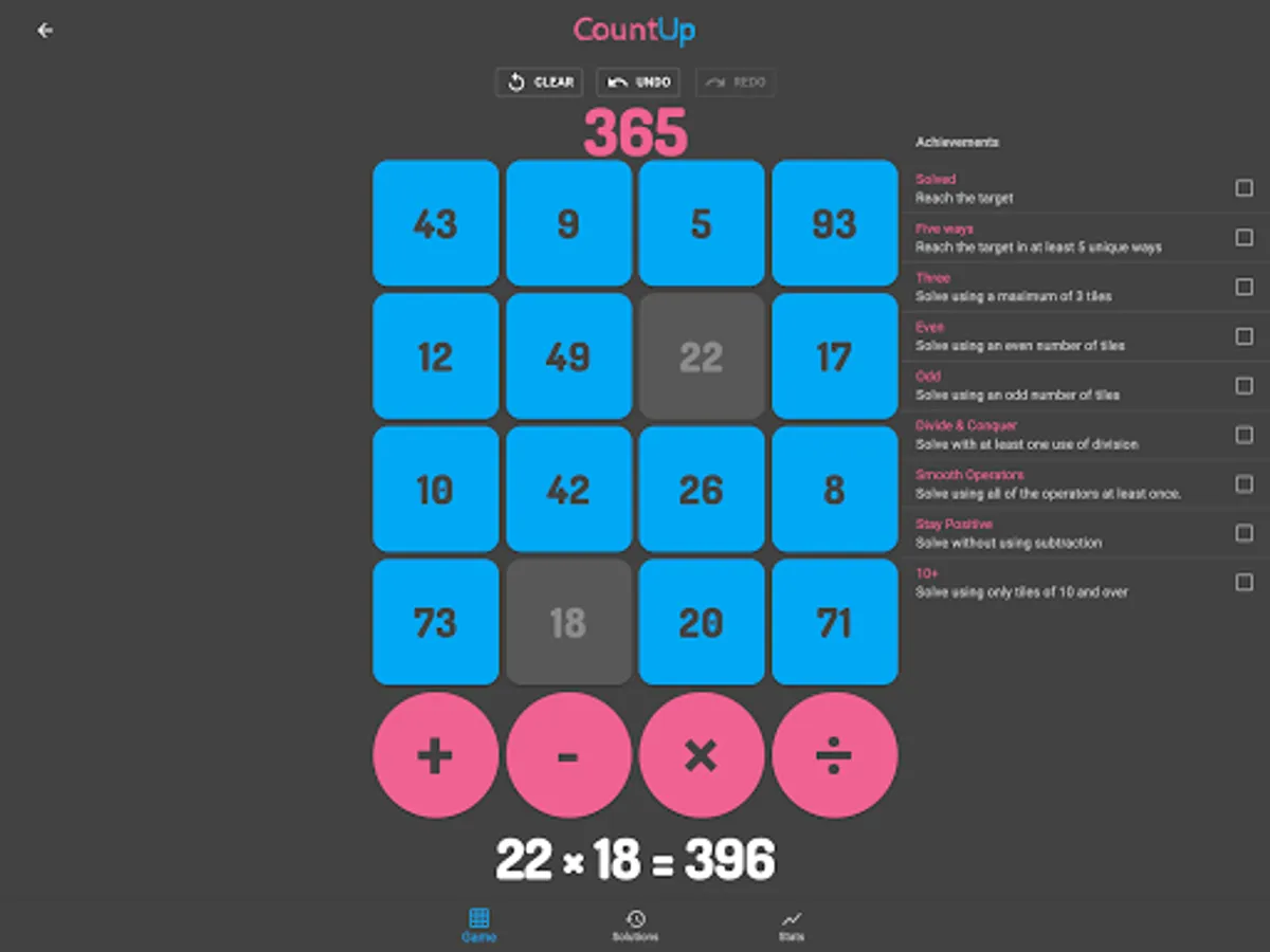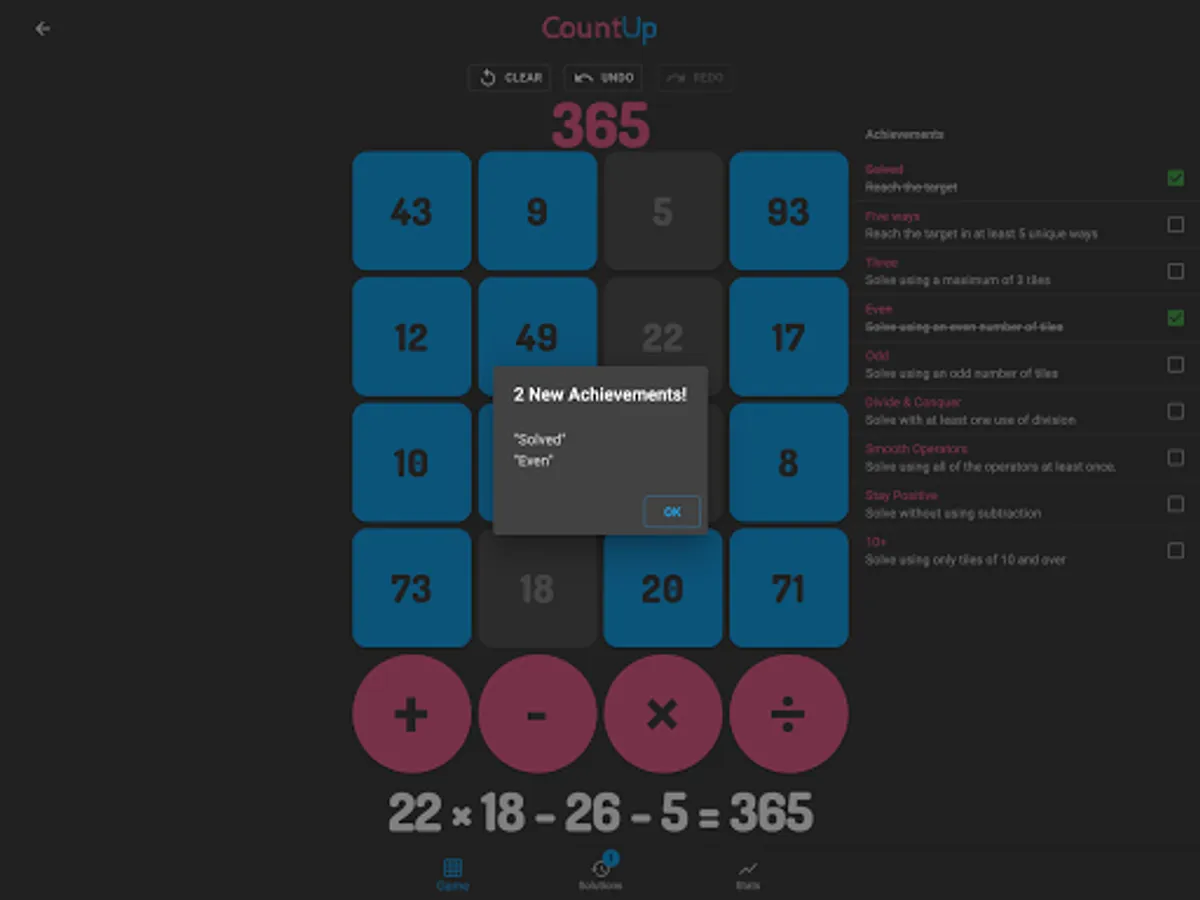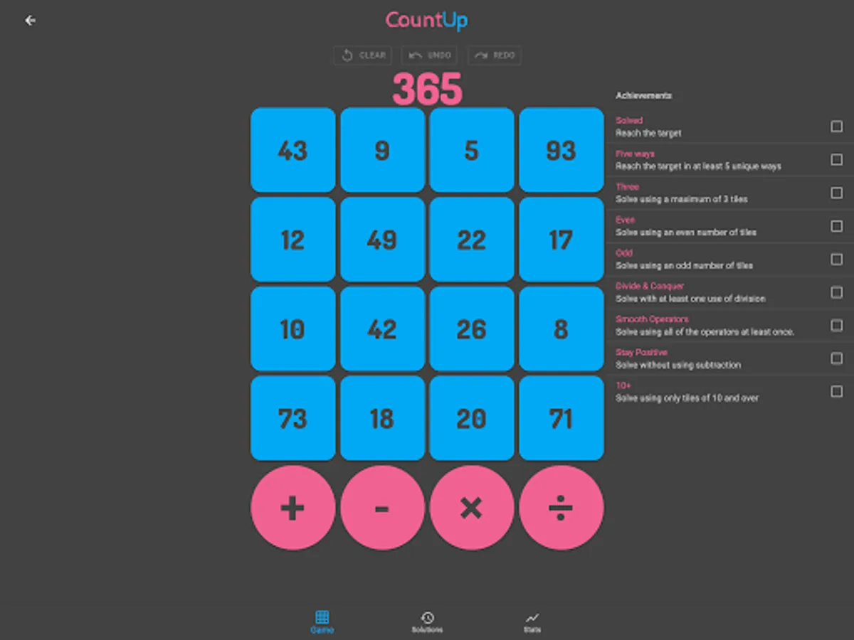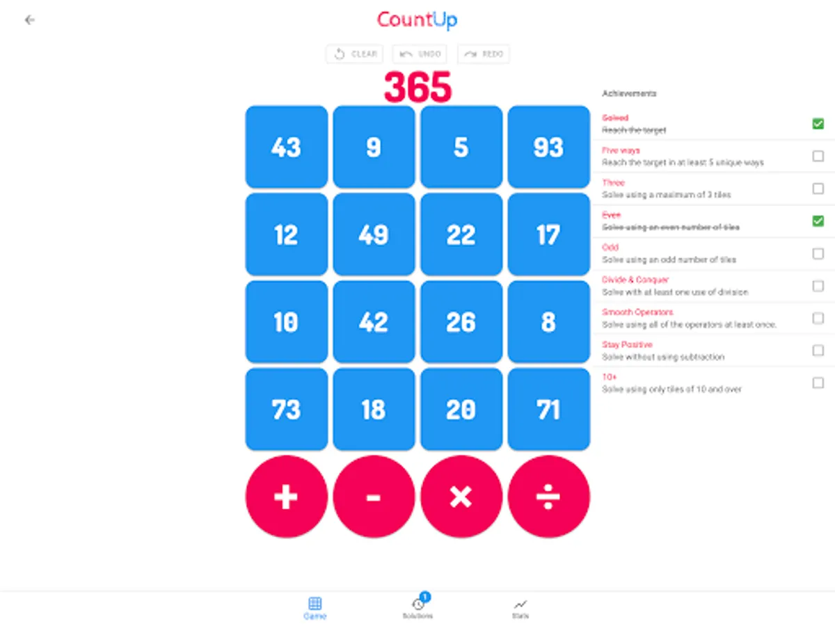 Reach the target total using the available number tiles and operators to create a running total. Find multiple solutions to unlock all achievements.