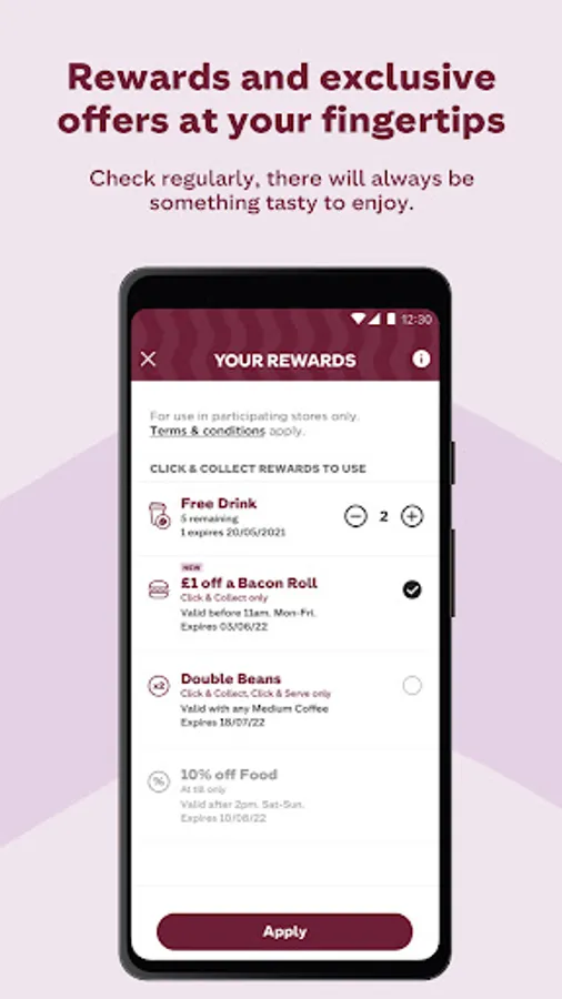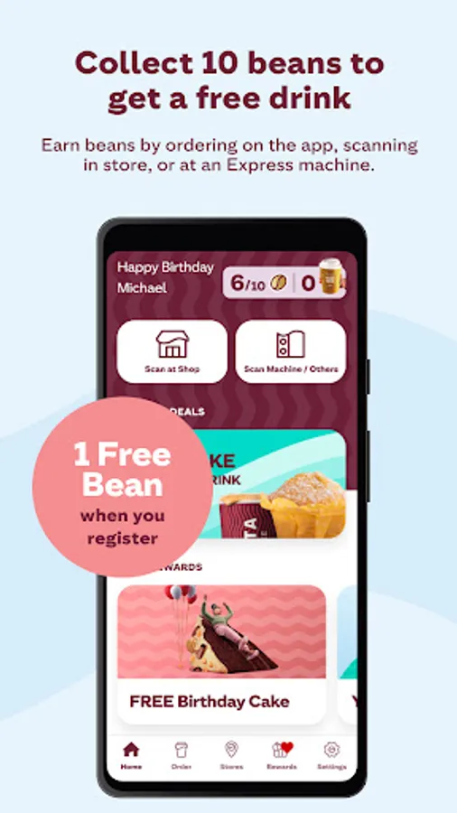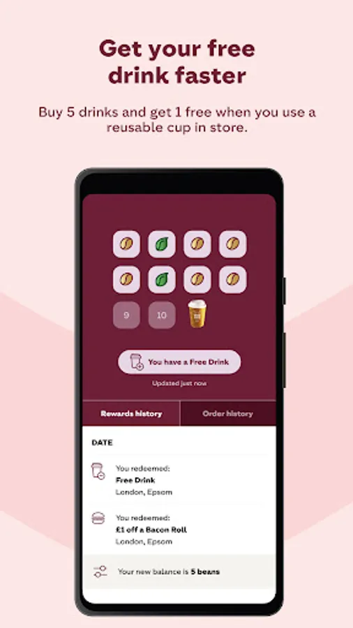 • Track your beans balance to see when you have enough for a free handcrafted drink