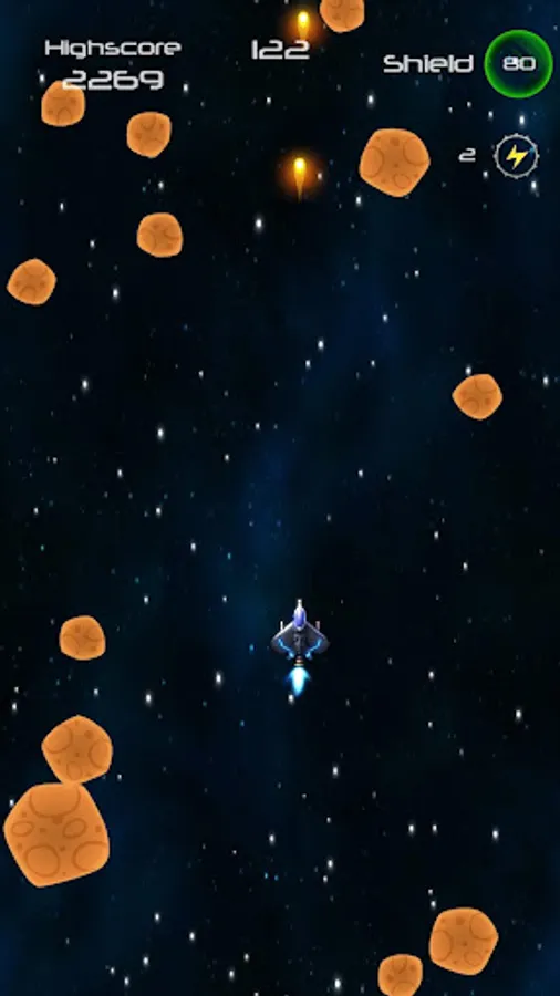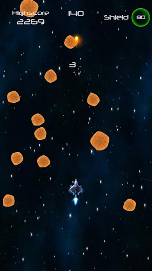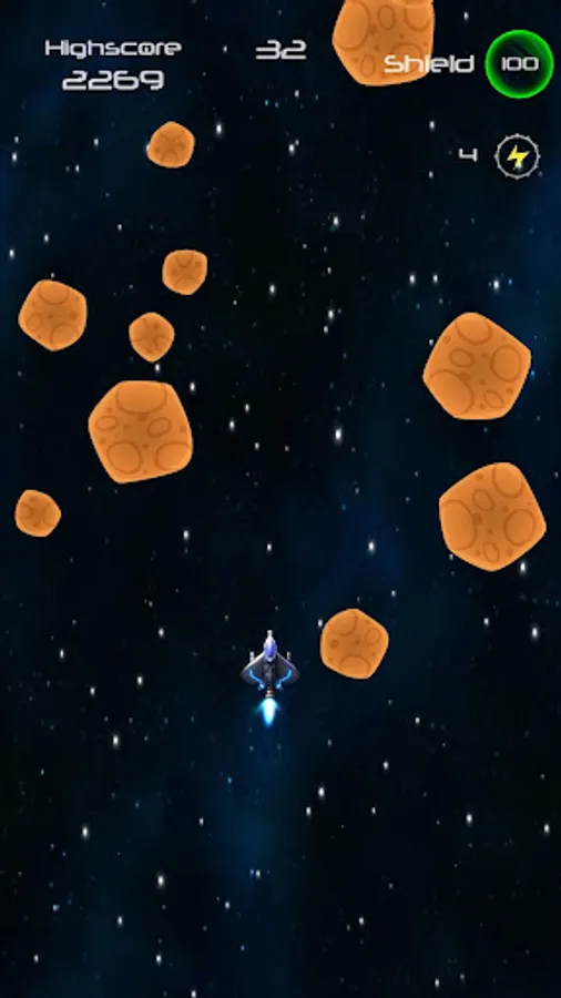 Speed through an ever growing asteroid field, blasting your way through or dodging around multiple sized rocks. Collect shield powerups to keep yourself protected.