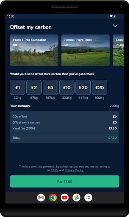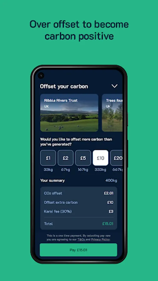 Karai is free to download and use, and you can pay to offset your emissions when you want to. You can even offset your carbon footprint to stay carbon positive.