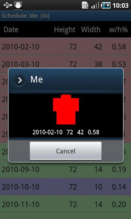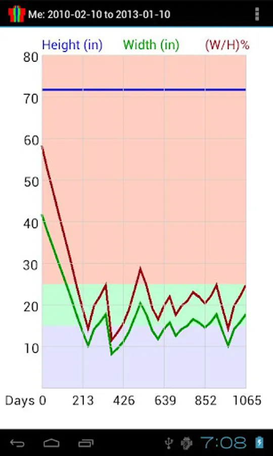 You can not only view the shape for your current height and width, but can keep a record of your measurements over a period of time and view, save, or email your records, and view them as graphs. These records and graphs can be used for your own body shape control or for medical purposes, if there is such need. And such records can be kept not only for yourself, but for all the members of your family, or any other group of people.