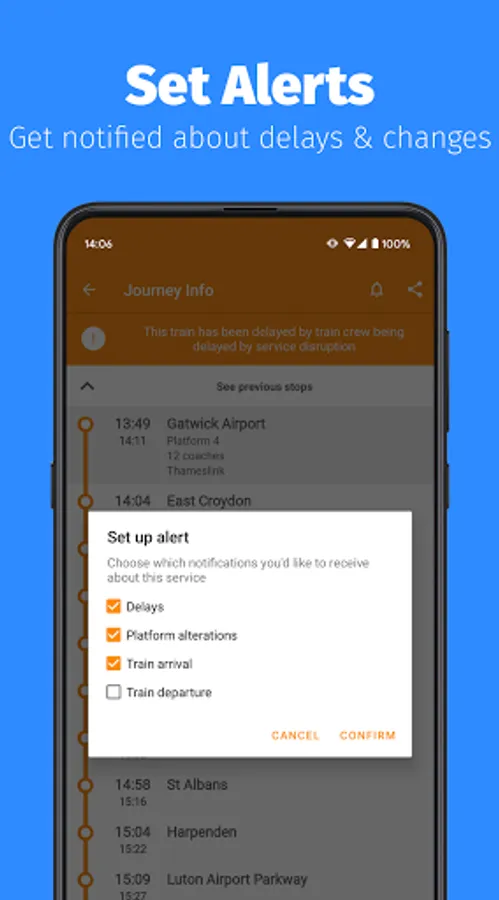 The first UK train app to provide alerts for your trains - simply find your upcoming train and set up an alert. Train Track will notify you when your train arrives, is delayed or changes platform.