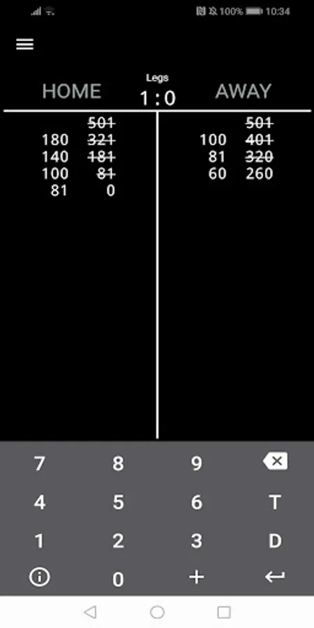 You have 3 options to score the darts. Either enter the total number hit, enter each dart score with the + symbol in-between, enter doubles and trebles by pressing (D) or (T) and the number hit. If you make a mistake entering the score press the delete button and last to remove the last score.