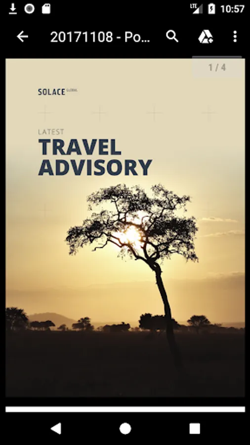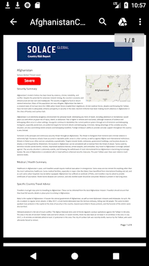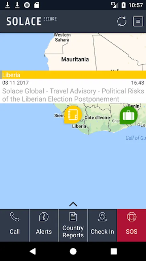 The Solace Secure smartphone application provides travellers with invaluable information relating to global risk whilst providing the ability to track travellers position in relation to these risks. On a 24 / 7 basis Solace Global monitors open source intelligence including global news outlets, social media, governmental travel advisories amongst others and provides this tool to access information quickly and easily. These ‘alerts’ are risk rated, categorised (Health, Terrorism, Environmental, Crime, Maritime, Armed Conflict, Political, Travel Information) and then geo-located. Users (the traveller) can therefore easily identify key threats in their immediate location and take measures to avoid and mitigate these risks. The inclusion of Check-in and SOS functionality allows our 24 hour operations centre to monitor medium and high-risk travellers in areas where additional level of reassurance is required. This application requires subscription to the Solace Secure platform which is available by contacting Solace Global direct.