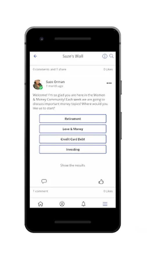 Suze Orman’s Women & Money Community is the place for all women eager to take control of their finances, learn the best way to navigate money challenges and the exclusive place to ask Suze a question directly. It is loaded with clear, actionable advice on a wide range of financial issues, straight from Suze. The heart of the Women & Money community is our members: women who share their stories, ask questions, and gain the confidence and motivation that comes from supporting each other on their personal journeys to financial independence. Suze will be an active part of the community, joining for live chats, sharing personal stories and responding to your questions with insightful and actionable advice.