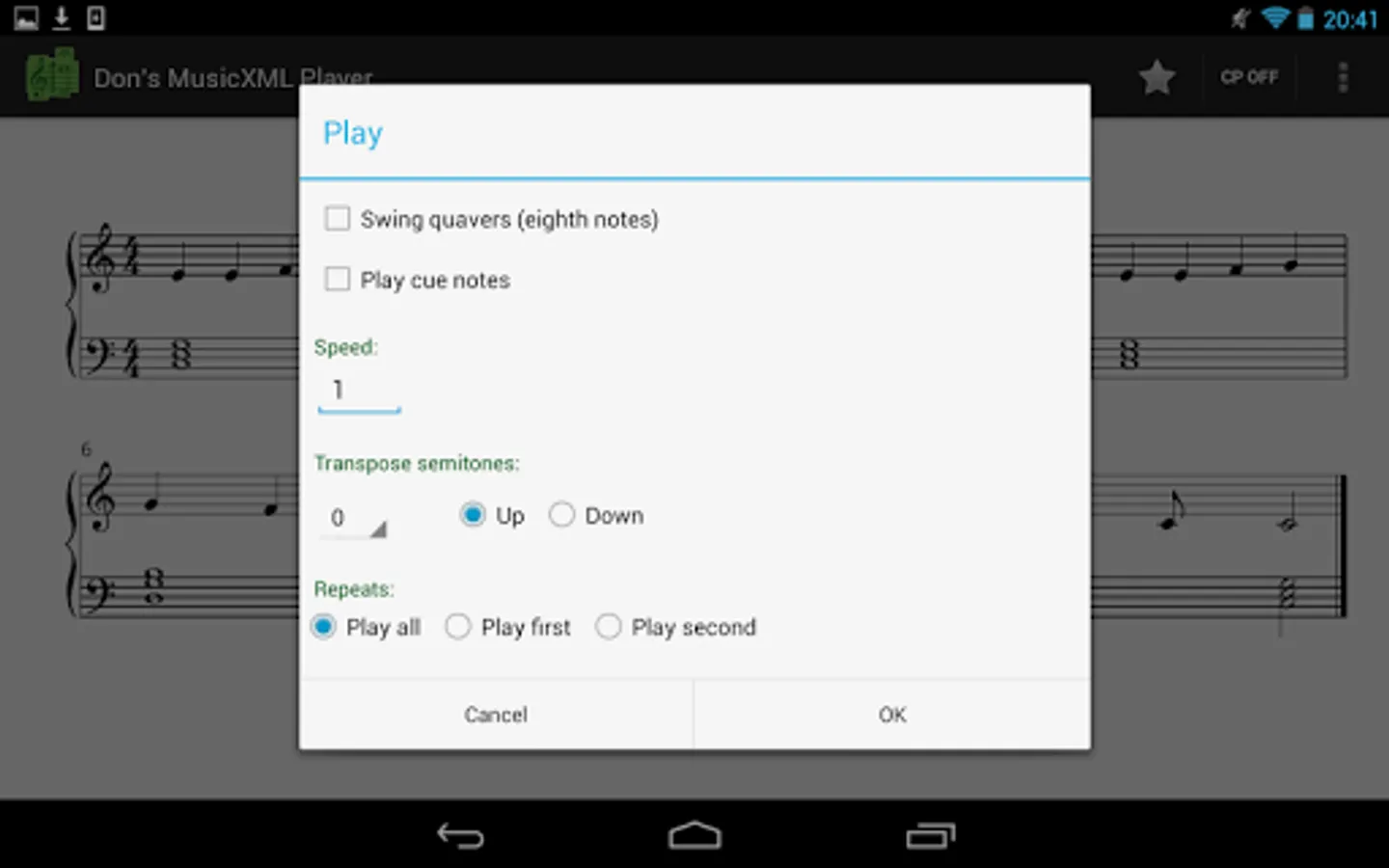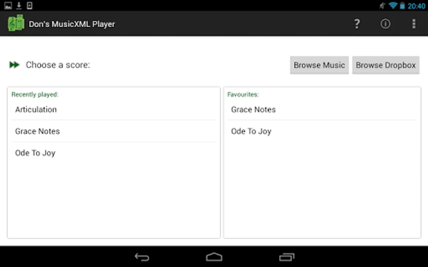You can display MusicXML files from your Android device's Music directory or a secondary directory e.g. Dropbox.
