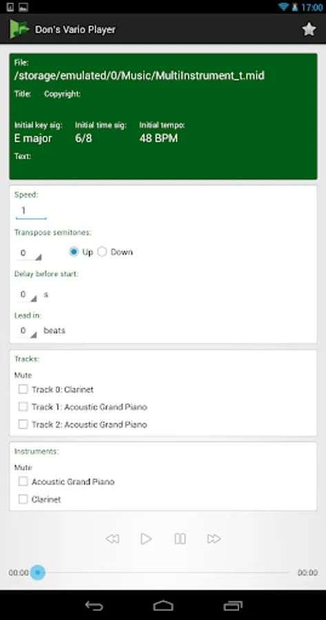 Note that there is also a free bonus feature: transposing and playing mp3 files at different speeds. This free feature is experimental and may not work on all Android devices.