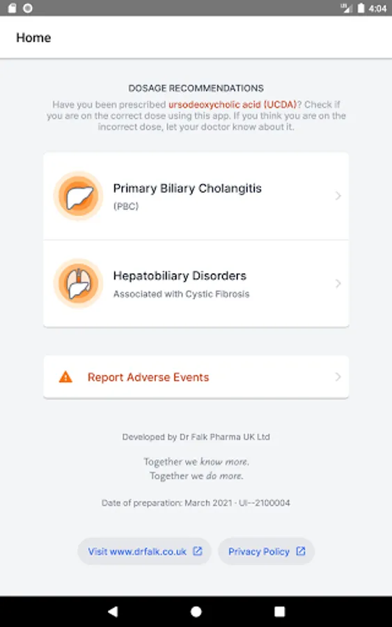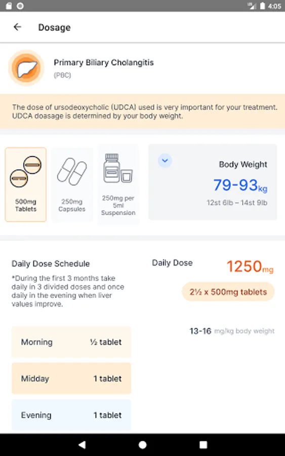 UDCA dosage recommendation for patients with PBC or hepatobiliary disorders associated with cystic fibrosis.