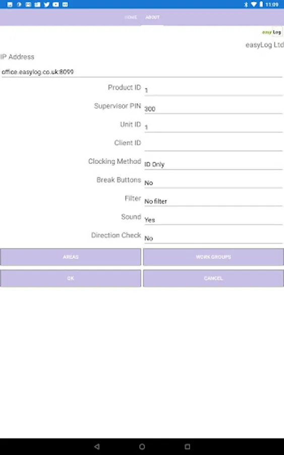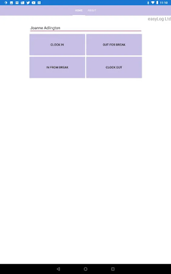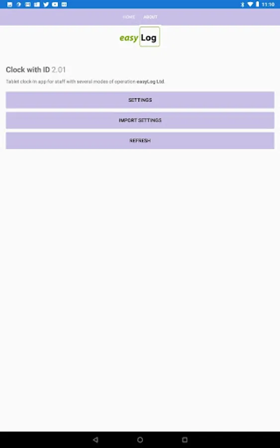 This app will be used on tablets for staff to clock in at remote locations. The settings page contains all information to connect to the remote server and configure the app for the appropriate method of clocking. Clicking on In or Out or Break allows the tablet to tell the remote server that the user is going in or out. The employee has to select their name from a drop down or type an ID. Once this is entered the remote server will confirm the user name if one exists. Pressing the confirm button will complete the clocking.