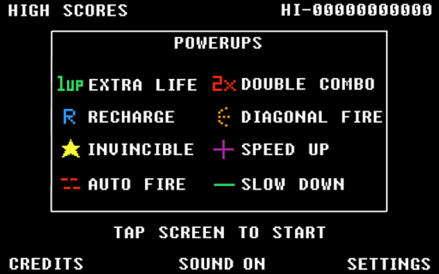 - Power ups including diagonal shooting, auto fire and extra lives.