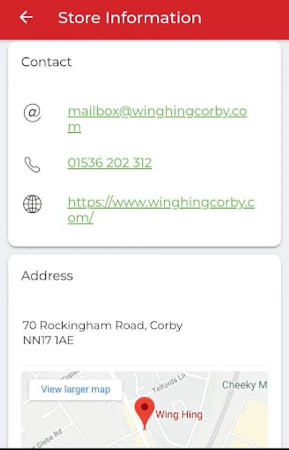 Wing Hing is located at 70 Rockingham Road, Corby, NN17 1AE is the place for you and all you need to do is decide what you want to eat.They have all those favourites dishes such as Curry Dishes, Beef Dishes, Duck Dishes, Omelette Dishes and many more