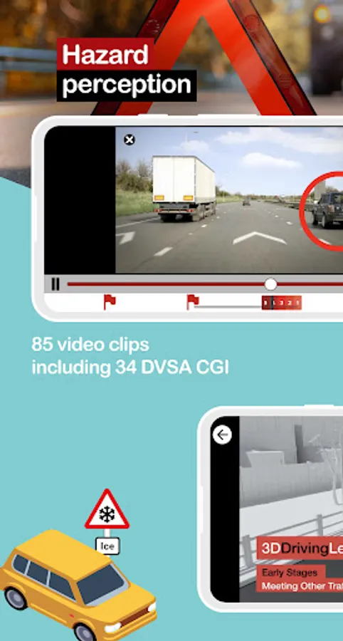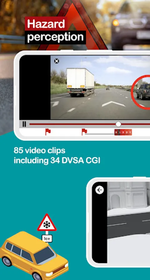 85 interactive video clips, including all 34 DVSA CGI clips covering bad weather and night time driving, with built-in cheat detection just like in the official UK Hazard Perception test.