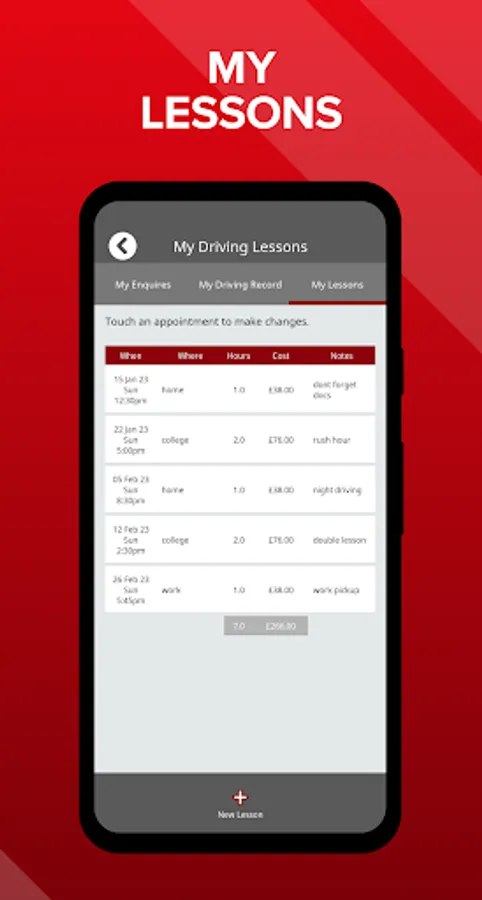 ✓ Keep a track of your driving lessons...add your lessons, times, dates, pick up point and lesson costs
