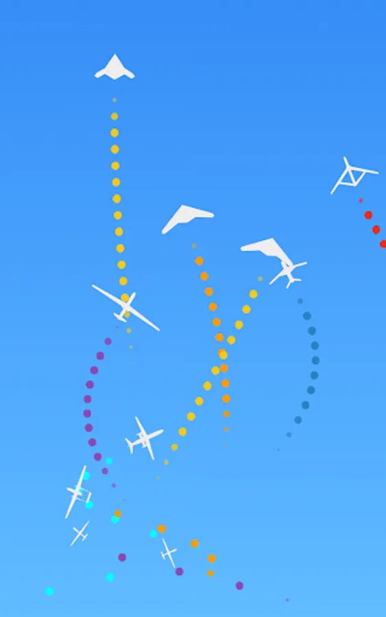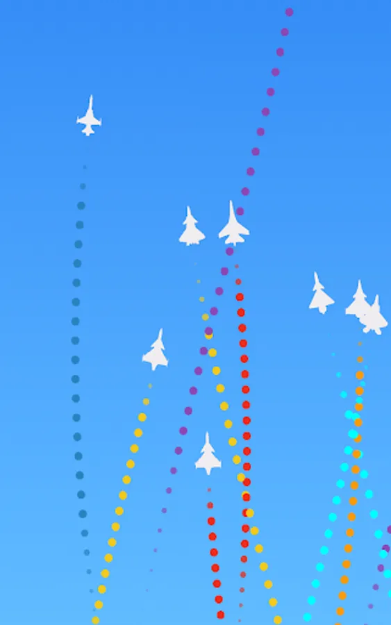 Flat-style civil aircraft fly across the screen trailing colored contrails.