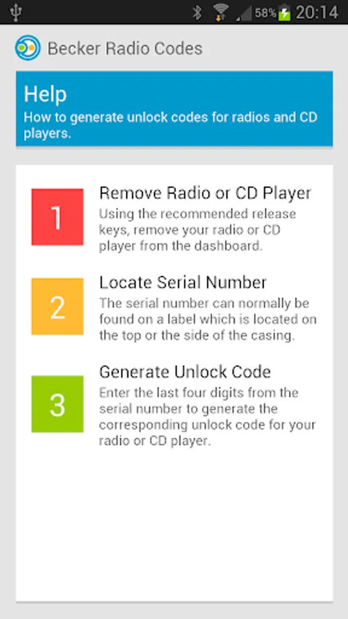 This application can provide you with the original manufacturer's security code required to activate your Becker car radio or CD player following a loss of power. Requests for security codes, which are handled by our servers, are made available by making an in-app purchase.