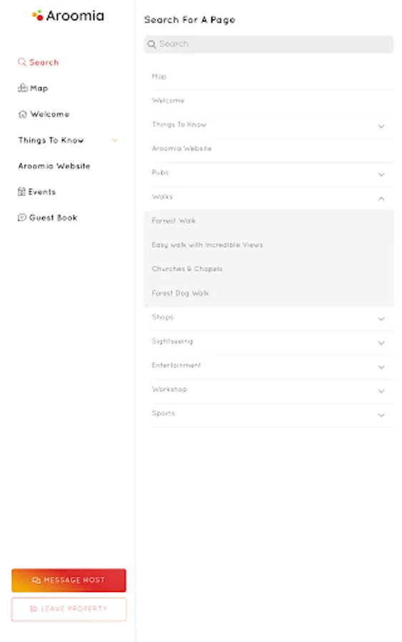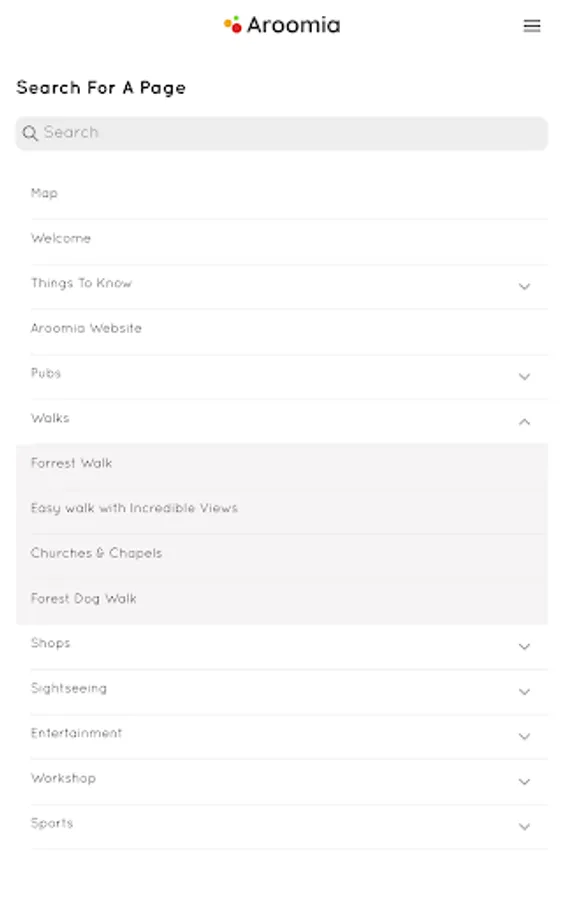 Search - Search allows you to search through the titles of places, pages and events within the app to find something quickly.