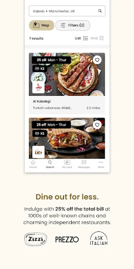 Download the Gourmet Society – Club Lloyds app today to save with all the offers below:- 25% off the total bill, including drinks, at 1000s of UK restaurants.
