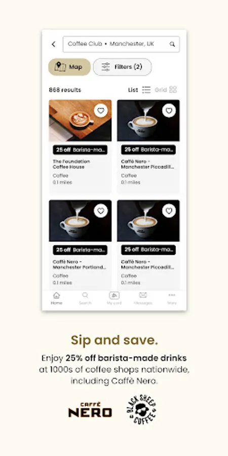 - 25% off barista-made drinks at Caffè Nero and thousands of coffee shops, 7 days a week with Coffee Club.