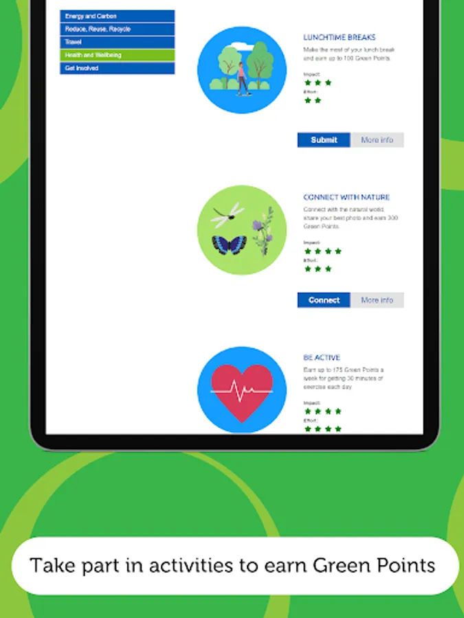 With this app you will be able to earn Green Points for your actions in themes including Energy and Carbon, Travel, Health and Wellbeing, Waste and Recycling and Get Involved.