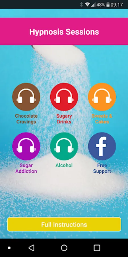 * 5 unique hypnosis sessions - sugar addiction, chocolate addiction, sweets, cakes & biscuits, sugary drinks and alcohol.
