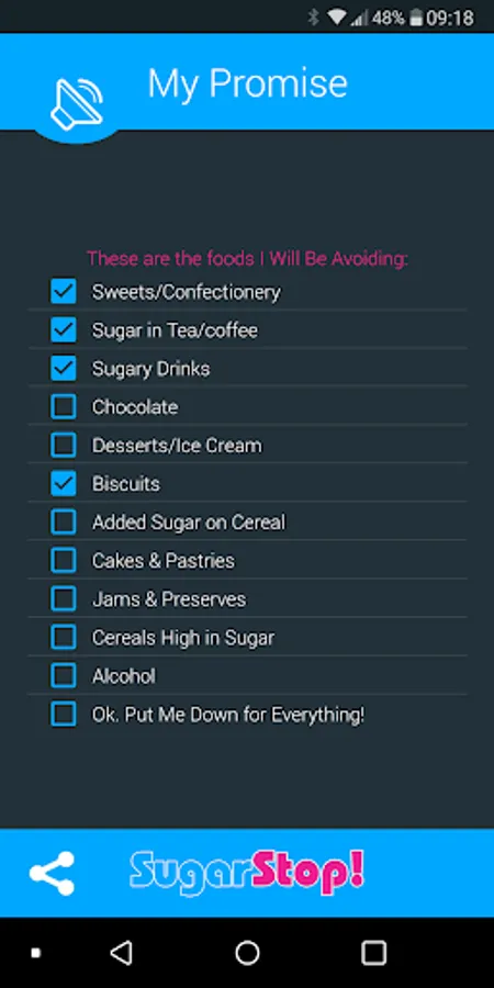 * 'My Promise' page to choose the sugary foods you're going to avoid for your challenge, then share it with your friends!