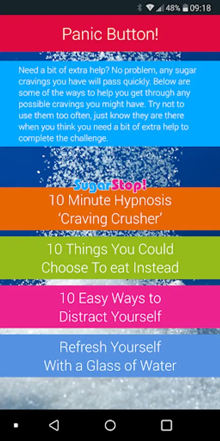 Your Sugar Stop Challenge app also comes with a panic button feature with a powerful 10 minute 'craving crusher' session, and lots of ideas and suggestions, for when a craving might kick in.