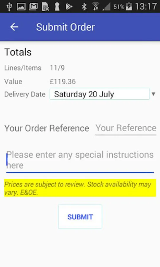 Once the App is initialised, you do not need to have an Internet Connection to compile your order or search for and add products. Obviously, an Internet Connection is required to actually submit your order.