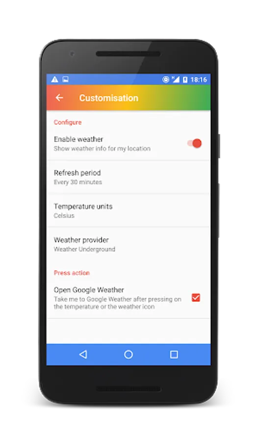 Note: Google Awareness roughly refreshes its data every 3 hours. Use another weather provider if you need more regular weather updates.