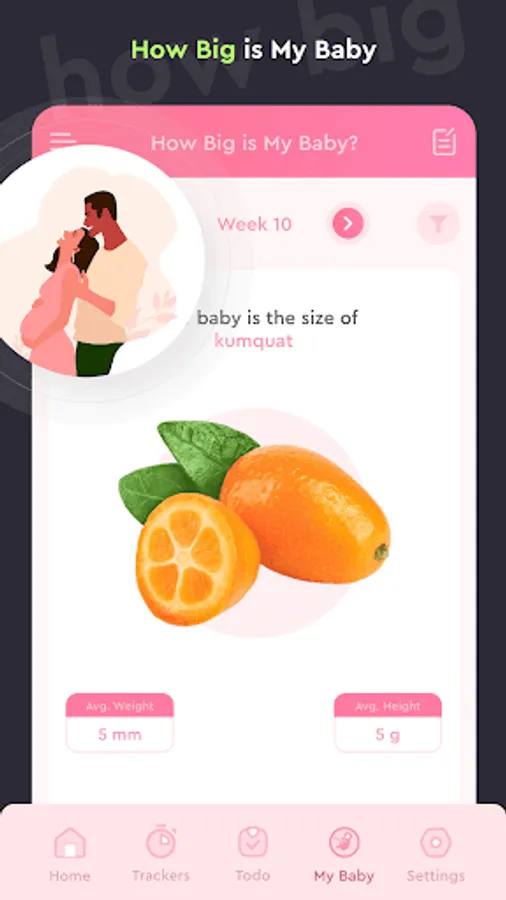 Experience the magic of pregnancy with our pregnancy tracker, which allows you to follow your baby's development week by week. From the very first day till your due date countdown, the app provides you with detailed insights into your baby’s growth. You can watch your baby grow with our baby growth calendar, which is specifically designed to help you track your baby’s growth during your pregnancy journey.