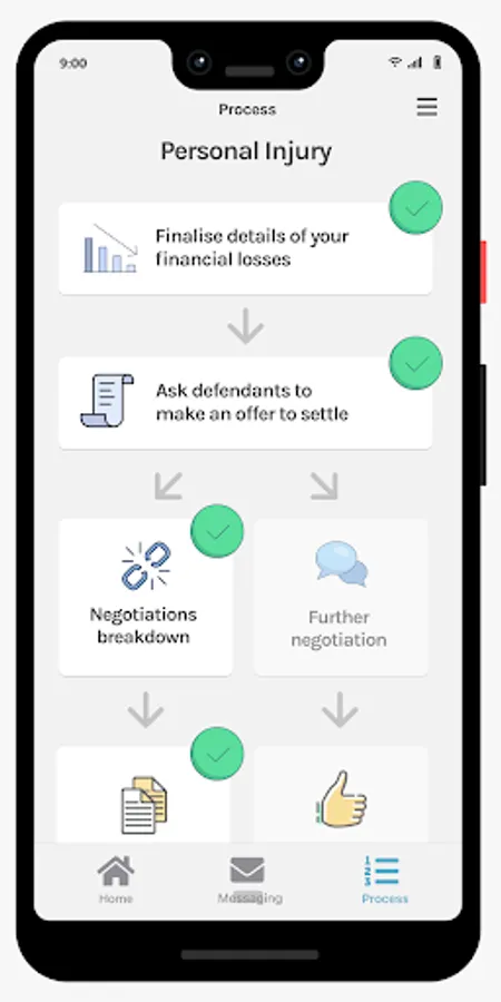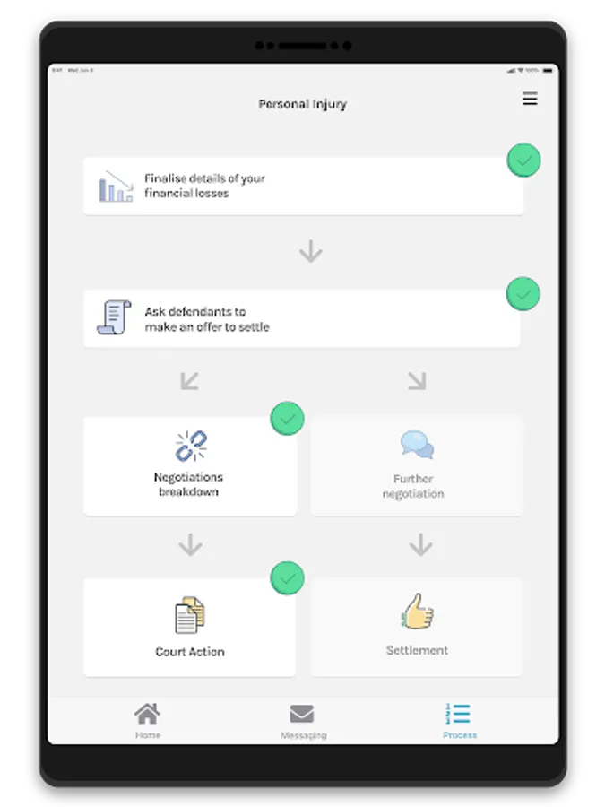 Our app aims to provide information about the steps to make a personal injury claim as well as linking your very own case to tell you where in the claims process you are and what is going to happen next. Communicate with your lawyer, 24 hours a day by sending messages and photos whenever you like. Your lawyer can also send messages to you which will be kept neatly within the app, recording everything permanently.