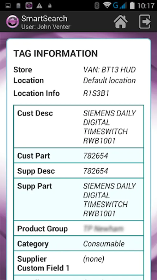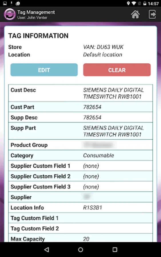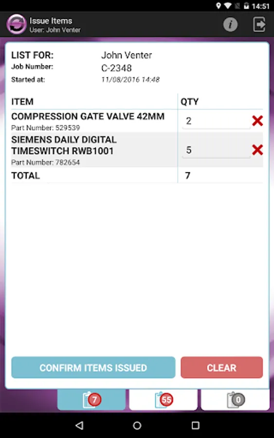 It comprises a SmartVan Android application that is downloaded to an Android compliant device with NFC (Near Field Communication) capability. This is linked in real time through 3G/4G to Inventor-e’s cloud-based SourcererTM software. The SmartVan App allows individual users to issue items to themselves or against a job code. The user logs in with their PIN. If job codes are required for allocation, then they are preloaded into Sourcerer and automatically appear on the user’s screen when logged in. If job codes are used, SmartVan will prevent items being issued unless a job code has been selected. The user then simply taps the phone against an Inventor-e NFC tag on the appropriate product bin - this creates the pick list of items and allows the user to enter quantities required. When the list is complete the user ends the transaction by tapping ‘Confirm Items Issued’.