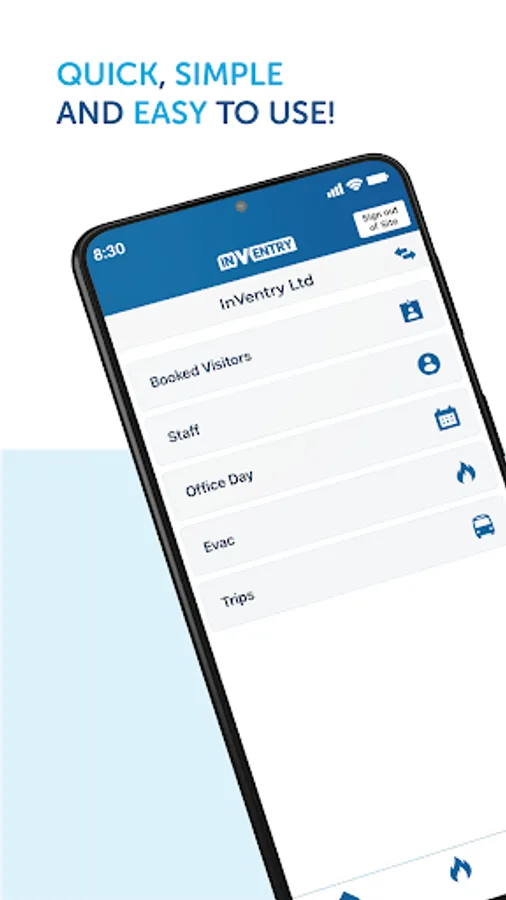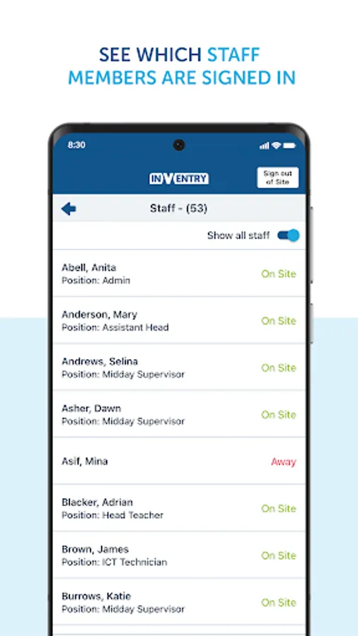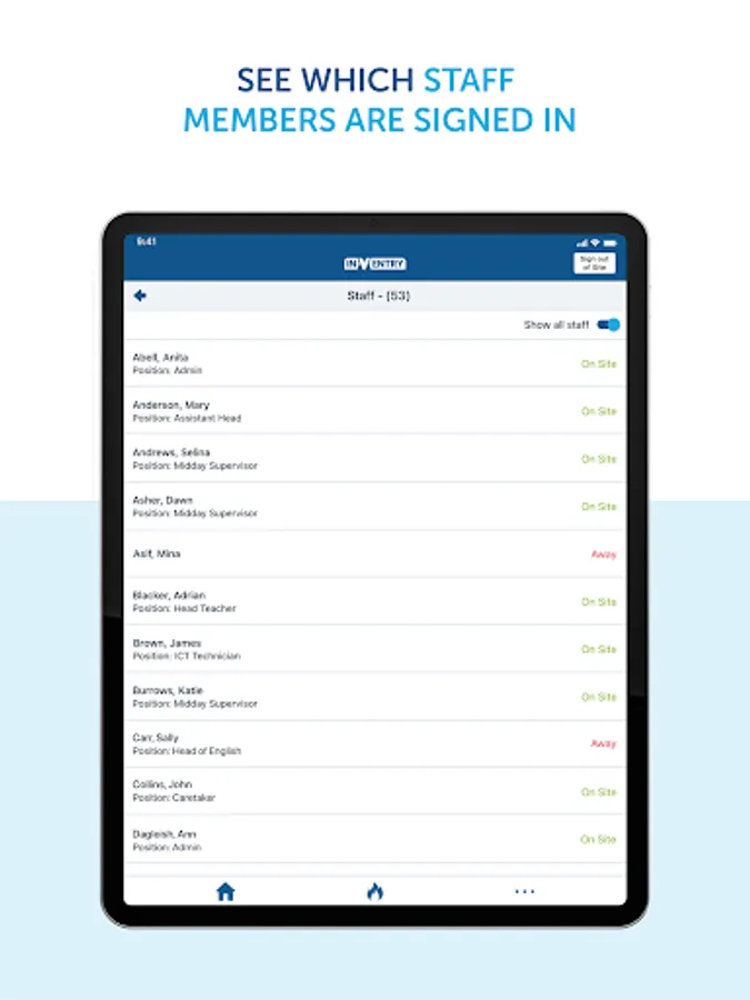 The staff element of the app allows users to remotely sign in and out of their organisation, using their device instead of using the InVentry touchscreen or ID card. They can also see at a glance who has signed in on that day. This is particularly useful if users quickly need to know if someone is onsite or not.
