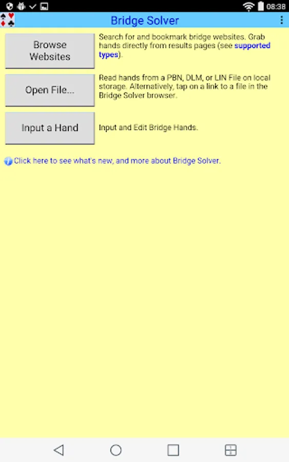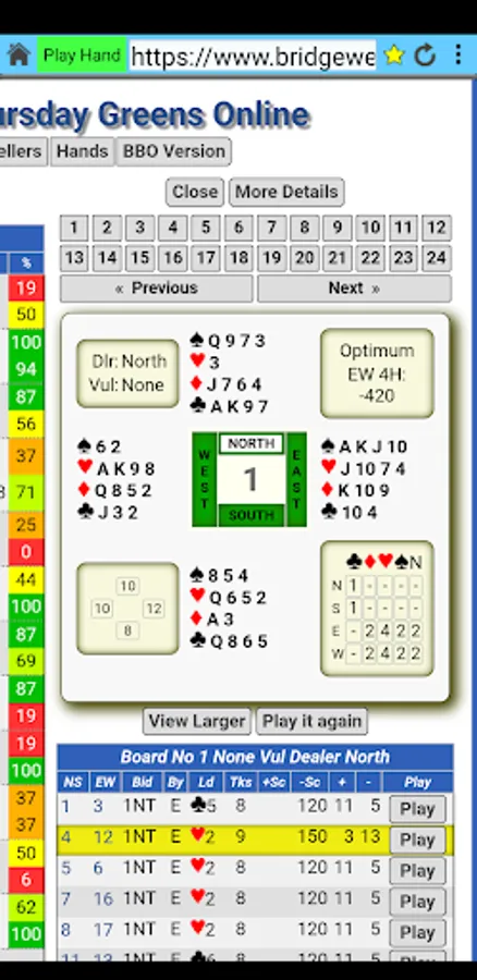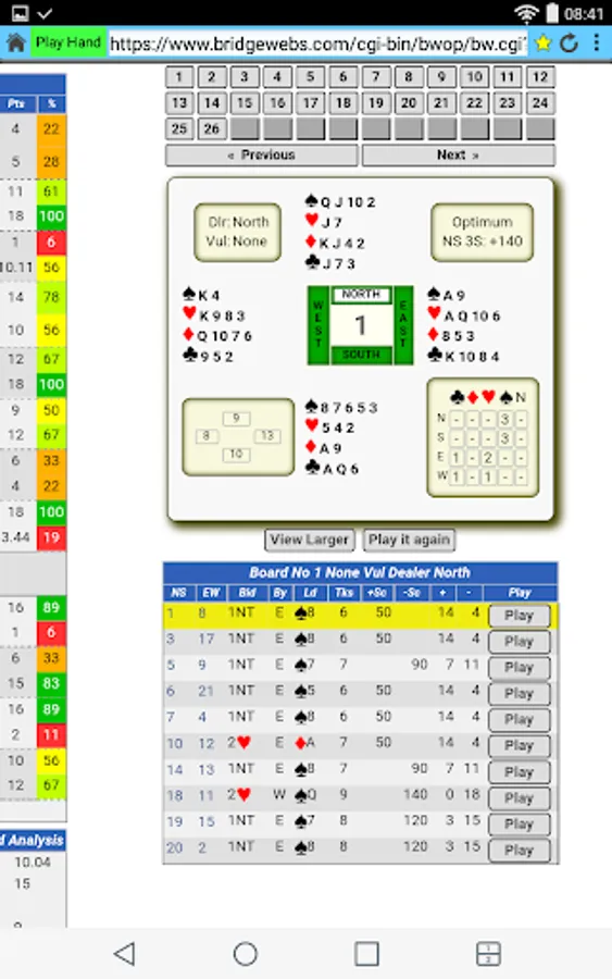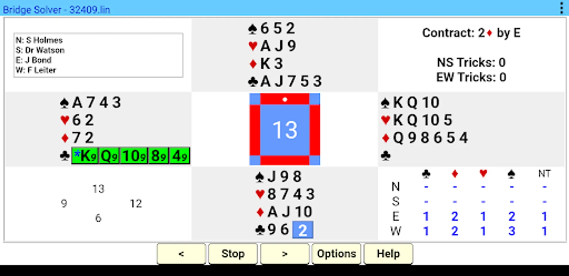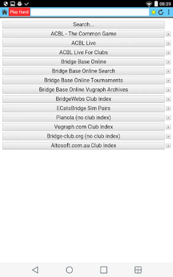 Enhance the experience of browsing session results on bridge websites. Bridge Solver can browse and bookmark websites, and grab hands directly from hand diagrams on web pages hosted on ACBL (several diagram formats, including ACBLmerge, ACBL Common Game, ACBL Live, ACBL Live For Clubs), BridgeWebs, Pianola, Bridge Base Online (movie links), EBU Sims, ECatsBridge Sims, Vugraph.com, Bridge-Club.org, and Altosoft.com.au. Analyse the hands through double dummy analysis or interactive card play.