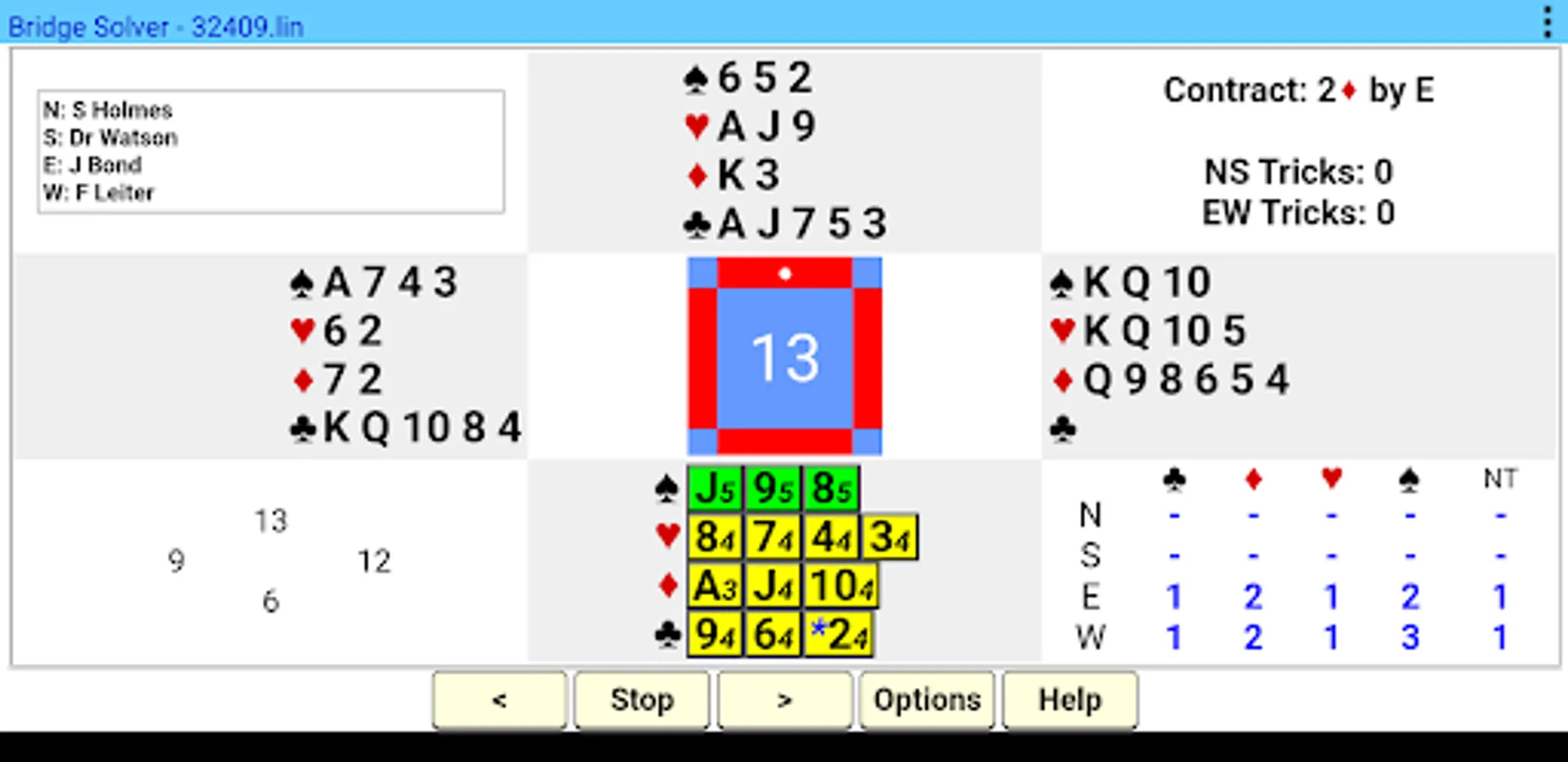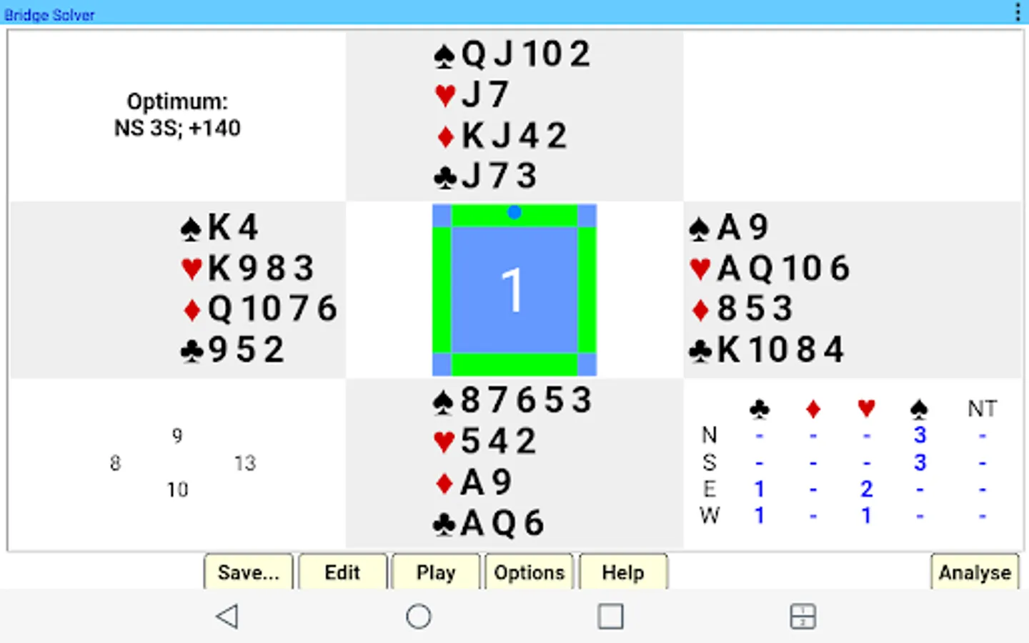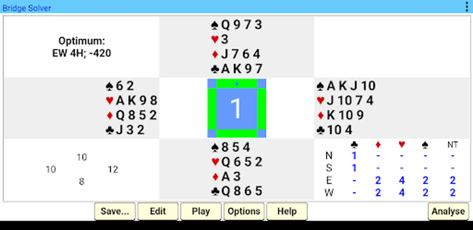 Interactive bridge hand analyser utilising Bo Haglund's well known double dummy solver module.