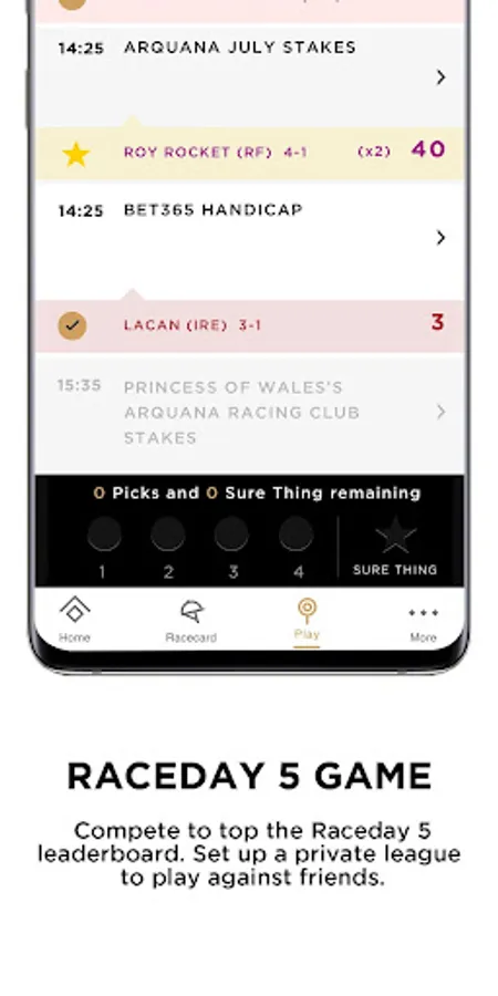 Compete against other racegoers in a live ‘Raceday 5’ game to top the leaderboard and be crowned ultimate raceday champion. You can also create a private league to compete against your friends.
