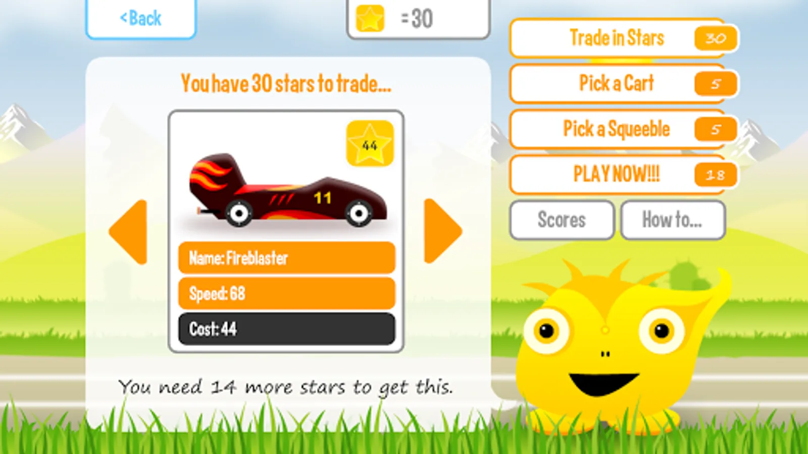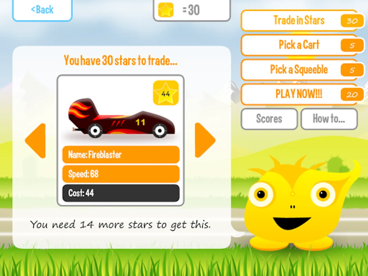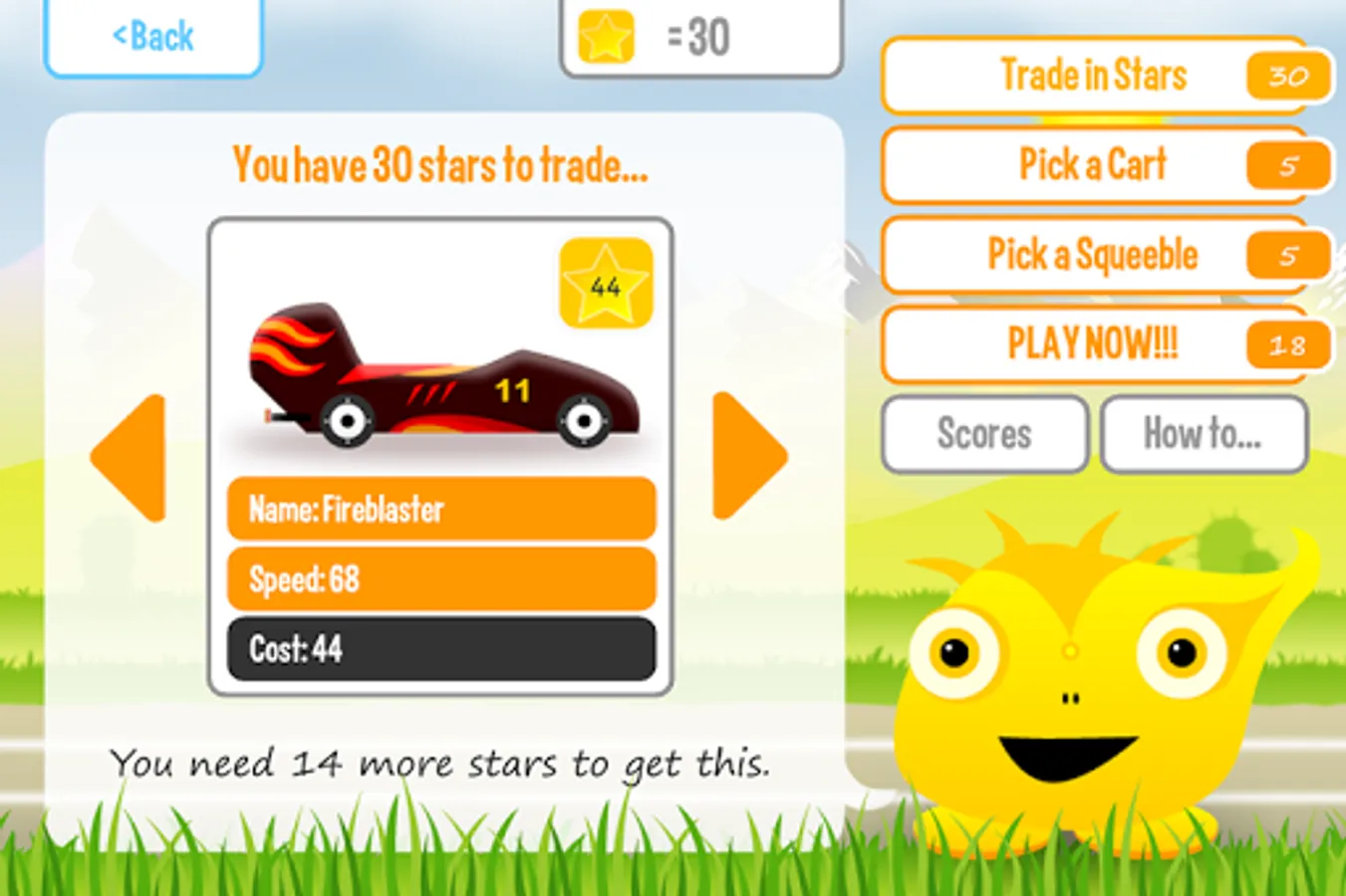 ★ Stars are awarded for completing tests correctly and in quick time. These can be traded for different cars to use in the squeeble-cart game. There are 40 cars to collect, each with different stats.