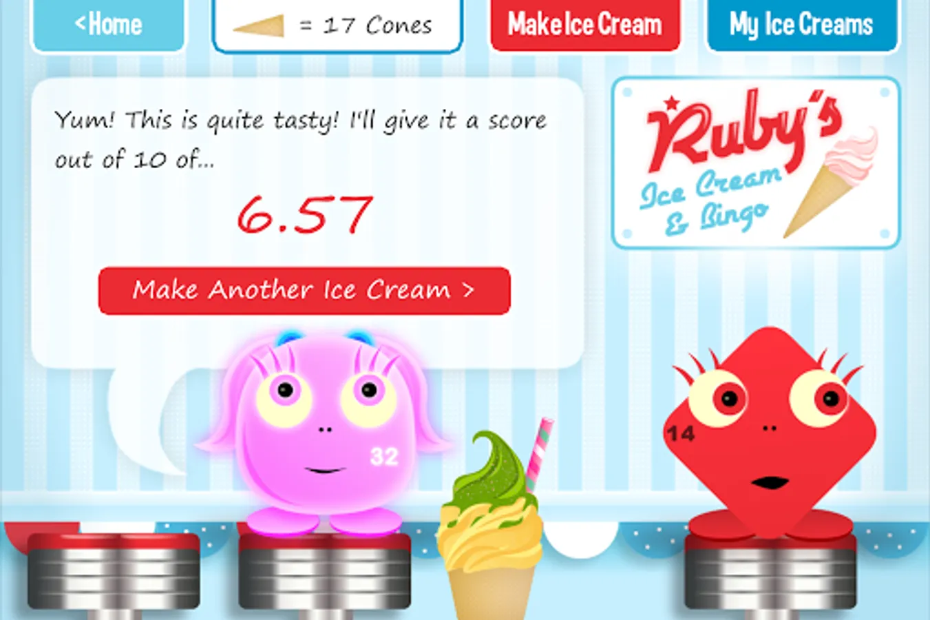 Make ice creams from over 200 unique ingredients and feed them to the Squeebles, who will give you marks out of ten, depending on how much they like them. Remember though - some of the Squeebles like some very strange flavours!!! Try brussel sprout ice cream with butterscotch sauce, sugar mice and a garlic breadstick! Or how about orange ice cream with pea soup sauce, chocolate pebbles and a lollipop! With over 3 million combinations, there's something in there for everyone (and every Squeeble!!!)