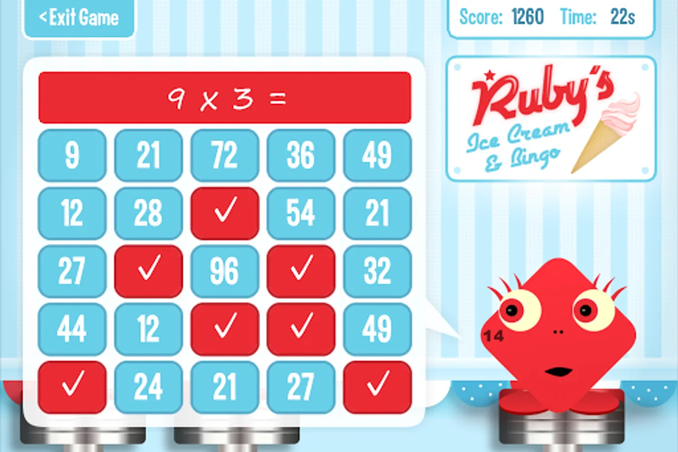 By answering addition, subtraction, multiplication and division problems in a fun bingo card game, help Ruby get her ingredients back and convince the 24 Squeeble customers to return.