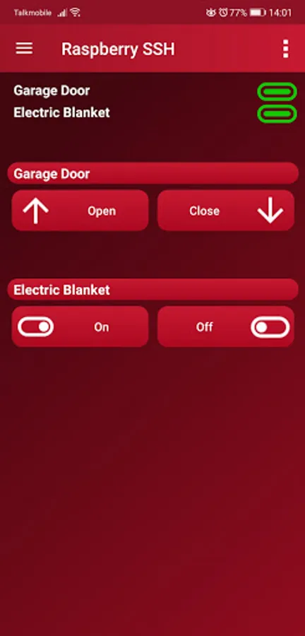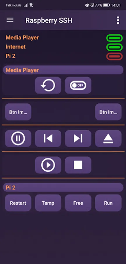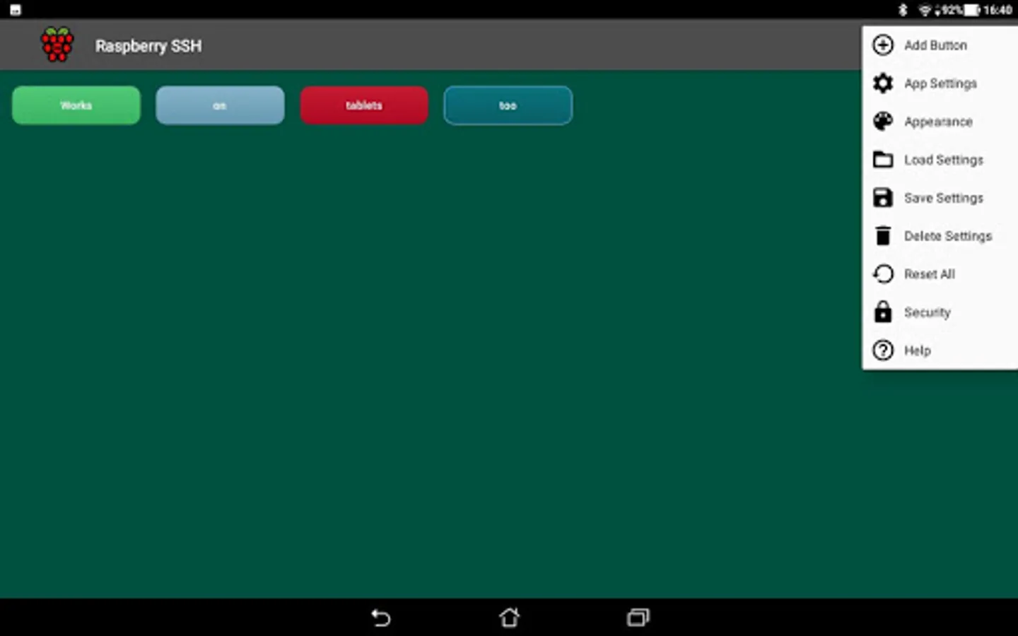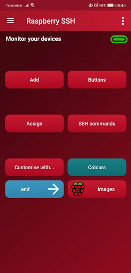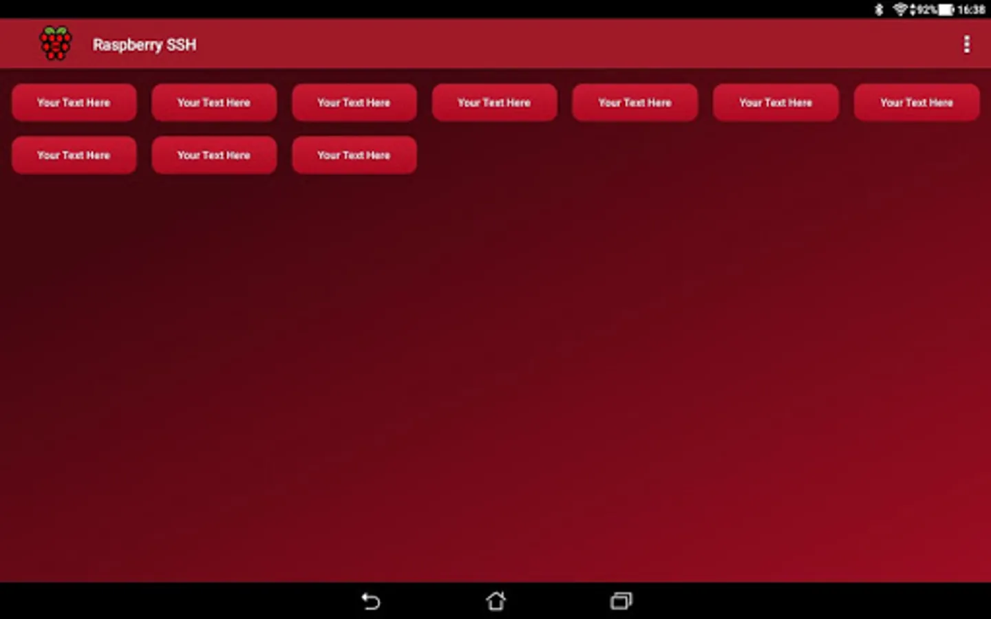 Raspberry SSH is an Android application designed to control a device via the creation of SSH buttons. Create a button. Configure your command and press the button to execute.