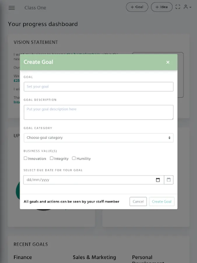 Set your businesses Vision, its goals and then actions you need to achieve your goals, run reports and receive notifications when goals are due.