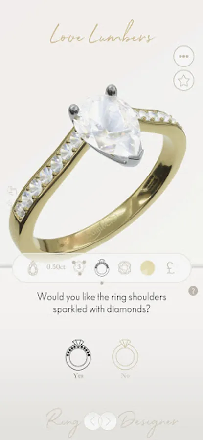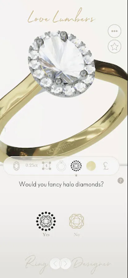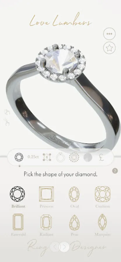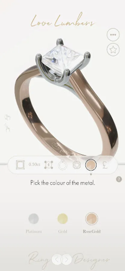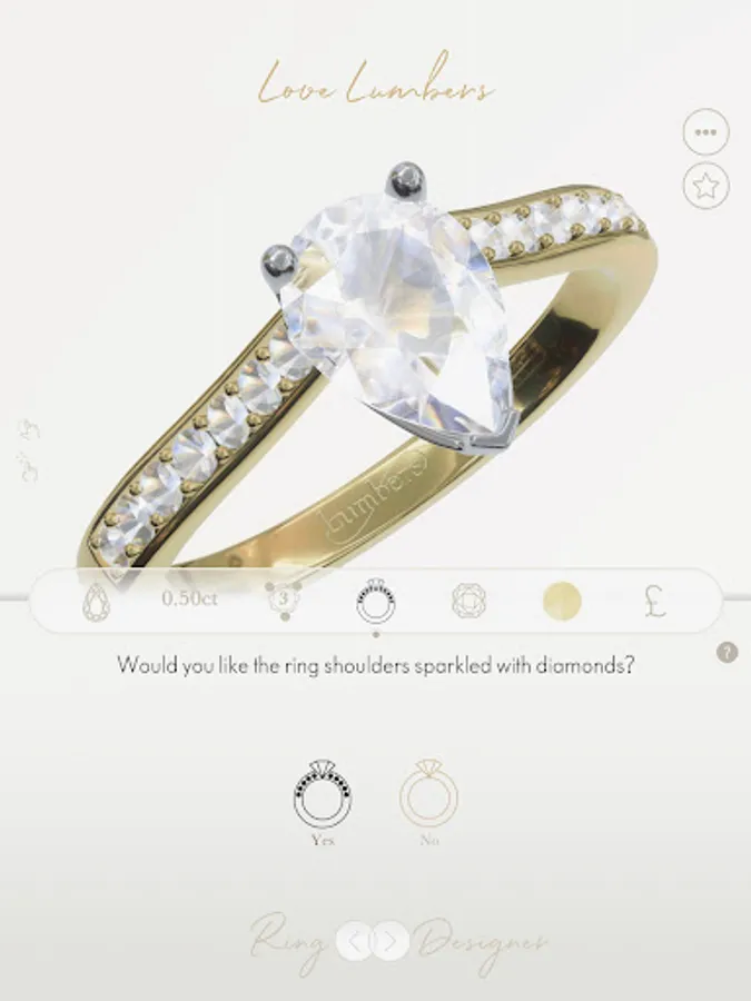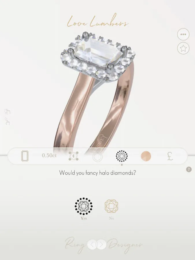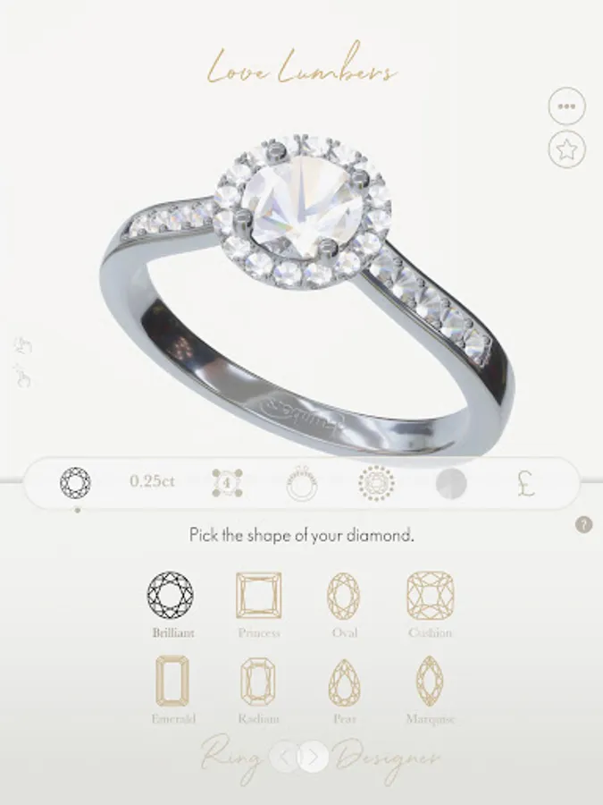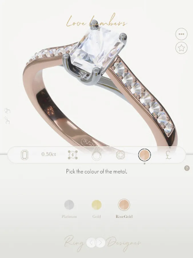 Use this incredible app to choose your diamond size, shape, extra sparkling features like halos and specify your precious metal from gold, rose gold and platinum. Your very own design is then priced, live in the app for you!