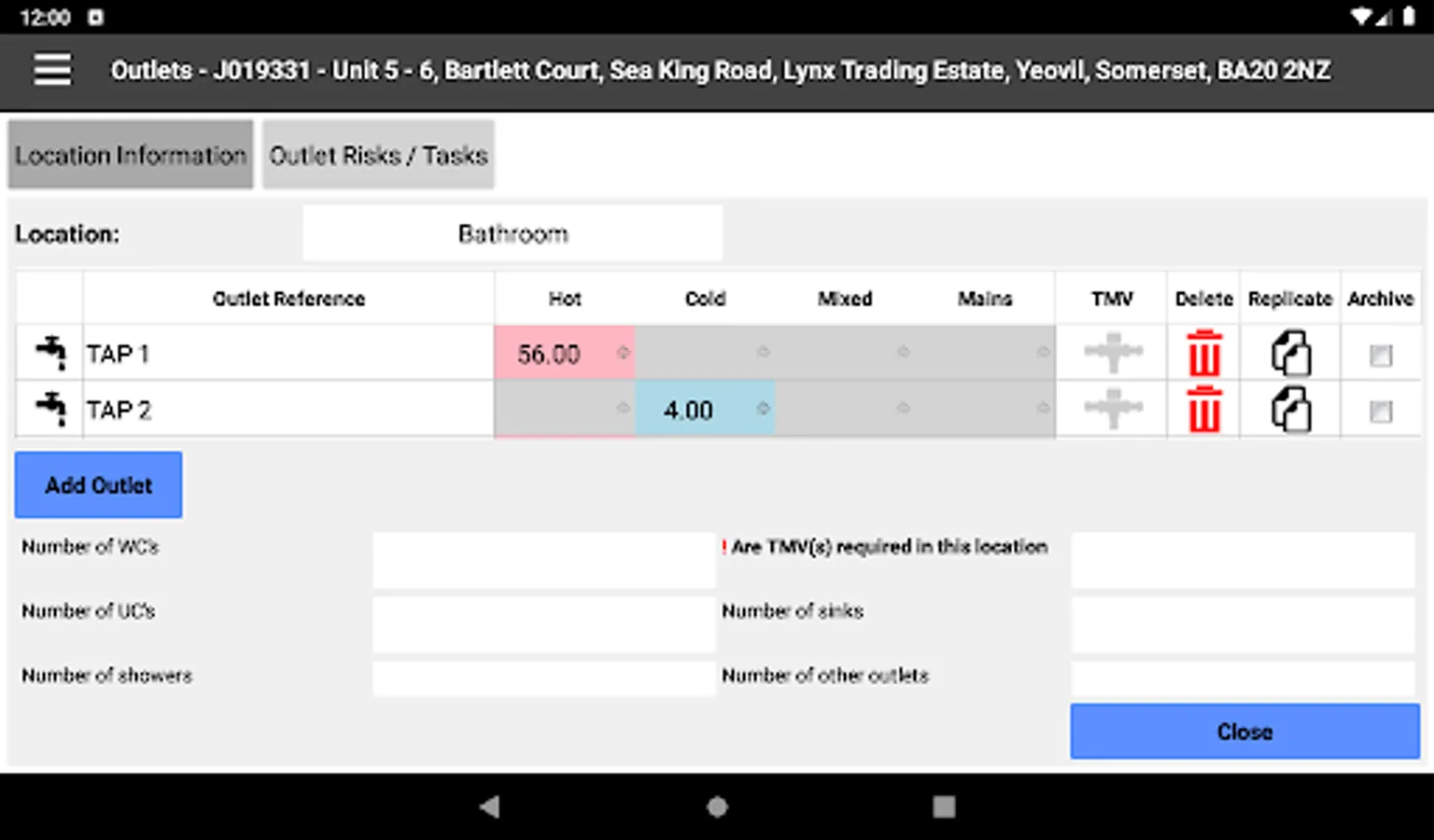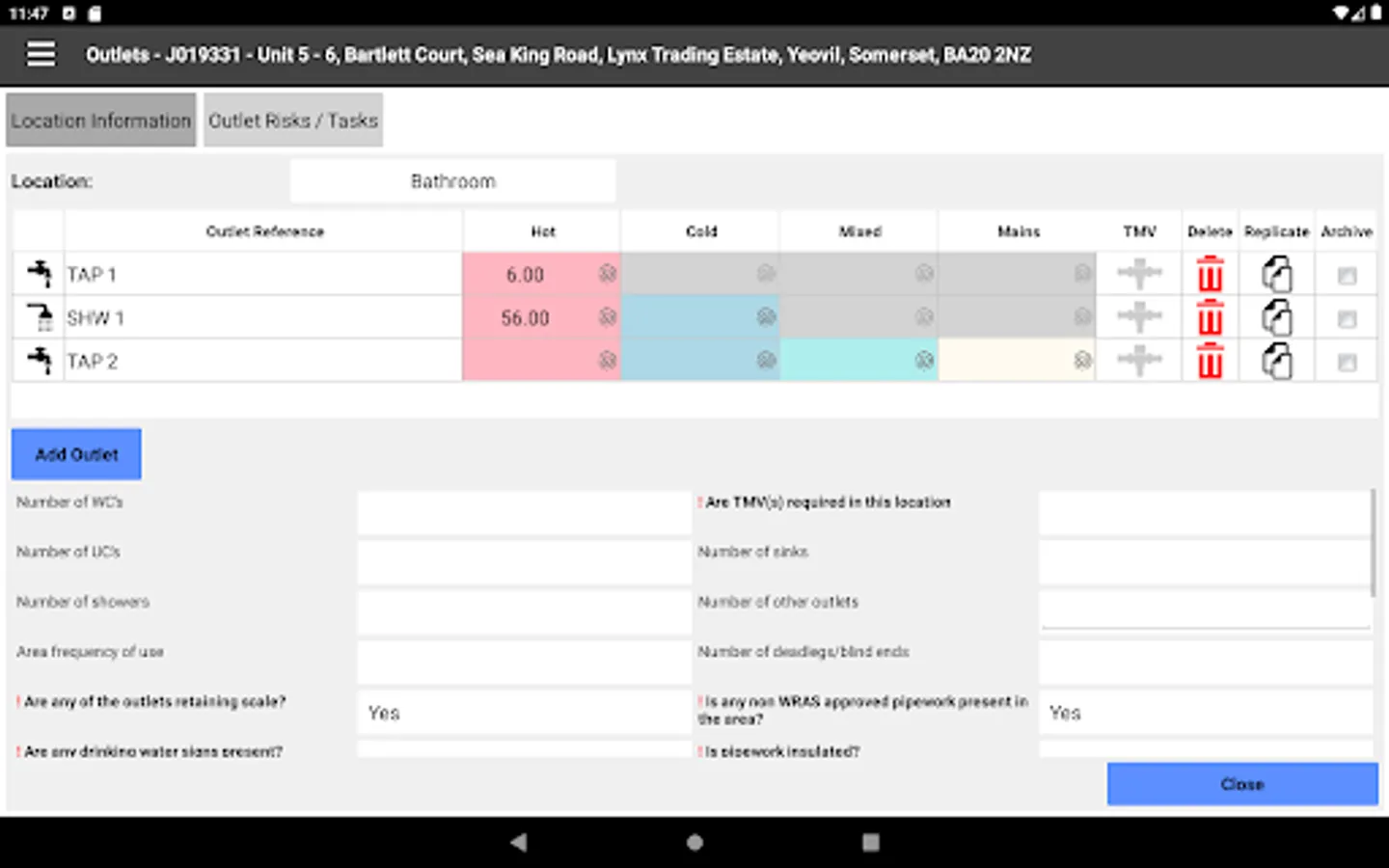 The TEAMS Legionella floorplan facility is integrated directly into the app and allows the creation of basic schematic diagrams utilising the assets and outlets already created during the onsite work.