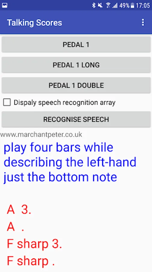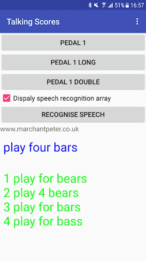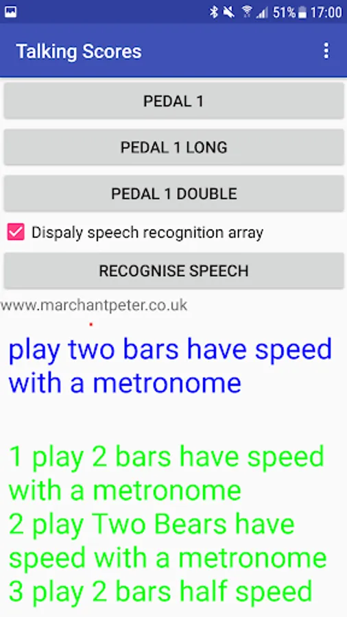 The screen contains 3 buttons to simulate pedal presses. The app will wait for speech input after the top button is pressed (pedal 1). there are buttons for long press and double press too. Under those 3 buttons is a check box to control which results are shown from speech recognition - unchecked = just the first result (shown in blue). Ticked = other results shown too (in green).
